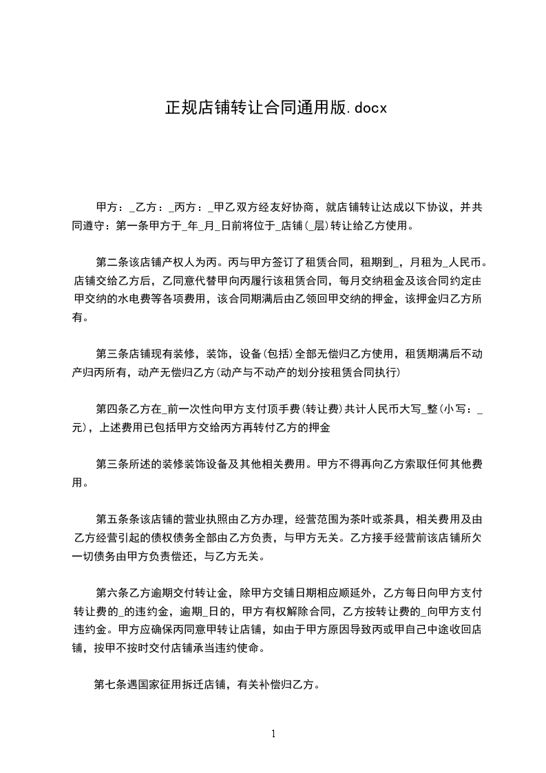 甲方:_乙方:_丙方:_甲乙双方经友好协商,就店铺转让达成以下协议,并共同遵守:第一条甲方于_年_月_日前将位于_店铺(_层)转让给乙方使用。