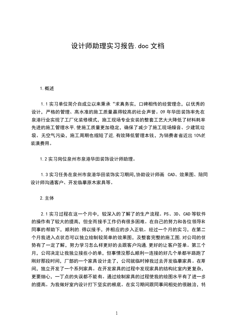 1.1实习单位简介自成立以来秉承“求真务实,口碑相传的经营理念,以优秀的设计,严格的管理、高水准的施工质量贏得较高的社会声誉。09年华田装饰率先在泉港行业实现了工厂化装修模式,施工现场专业安装的整套工艺大大降低了材料耗率,先进的施工管理水平,使施工质量更加稳定,确保了减少了施工现场燥音、少建筑垃圾、无空气污染,施工周期也缩短了近,有效降低管理本钱,为销费者省近出10%的装潢费用。