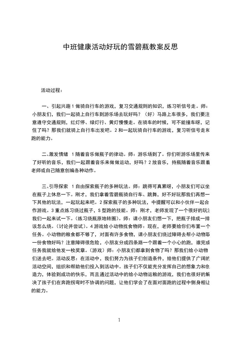 3、重点练习绕过瓶子,S型跑的技能。师:刚才,老师发现了一个很好的玩法,我们一起来试一下。(练习绕瓶原地转圈)。师:请小朋友们想一下,把瓶子排成一排该怎么绕。(幼儿讨论并尝试)。