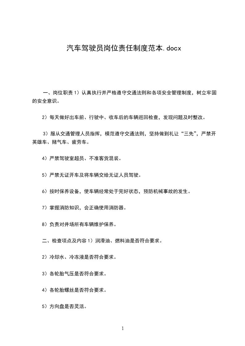 一、岗位职责1)认真执行并严格遵守交通法则和各项安全管理制度,树立牢固的安全意识。