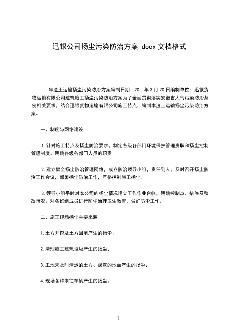 ___年渣土运输扬尘污染防治方案编制日期:20__年3月20日编制单位:迅银货物运输有限公司建筑施工扬尘污染防治方案为了全面贯彻落实安徽省大气污染防治条例相关要求,结合迅银货物运输有限公司施工特点,编制本渣土运输扬尘污染防治方案。