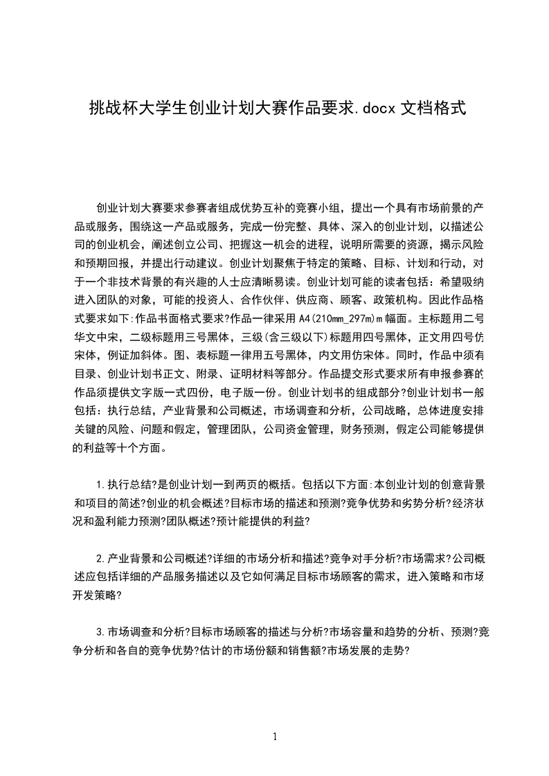 创业计划大赛要求参赛者组成优势互补的竞赛小组,提出一个具有市场前景的产品或服务,围绕这一产品或服务,完成一份完整、具体、深入的创业计划,以描述公司的创业机会,阐述创立公司、把握这一机会的进程,说明所需要的资源,揭示风险和预期回报,并提出行动建议。创业计划聚焦于特定的策略、目标、计划和行动,对于一个非技术背景的有兴趣的人士应清晰易读。创业计划可能的读者包括:希望吸纳进入团队的对象,可能的投资人、合作伙伴、供应商、顾客、政策机构。因此作品格式要求如下:作品书面格式要求?作品一律采用A4(210mm_297m)m幅面。主标题用二号华文中宋,二级标题用三号黑体,三级(含三级以下)标题用四号黑体,正文用四号仿宋体,例证加斜体。图、表标题一律用五号黑体,内文用仿宋体。同时,作品中须有目录、创业计划书正文、附录、证明材料等部分。作品提交形式要求所有申报参赛的作品须提供文字版一式四份,电子版一份。创业计划书的组成部分?创业计划书一般包括:执行总结,产业背景和公司概述,市场调查和分析,公司战略,总体进度安排,关键的风险、问题和假定,管理团队,公司资金管理,财务预测,假定公司能够提供的利益等十个方面。