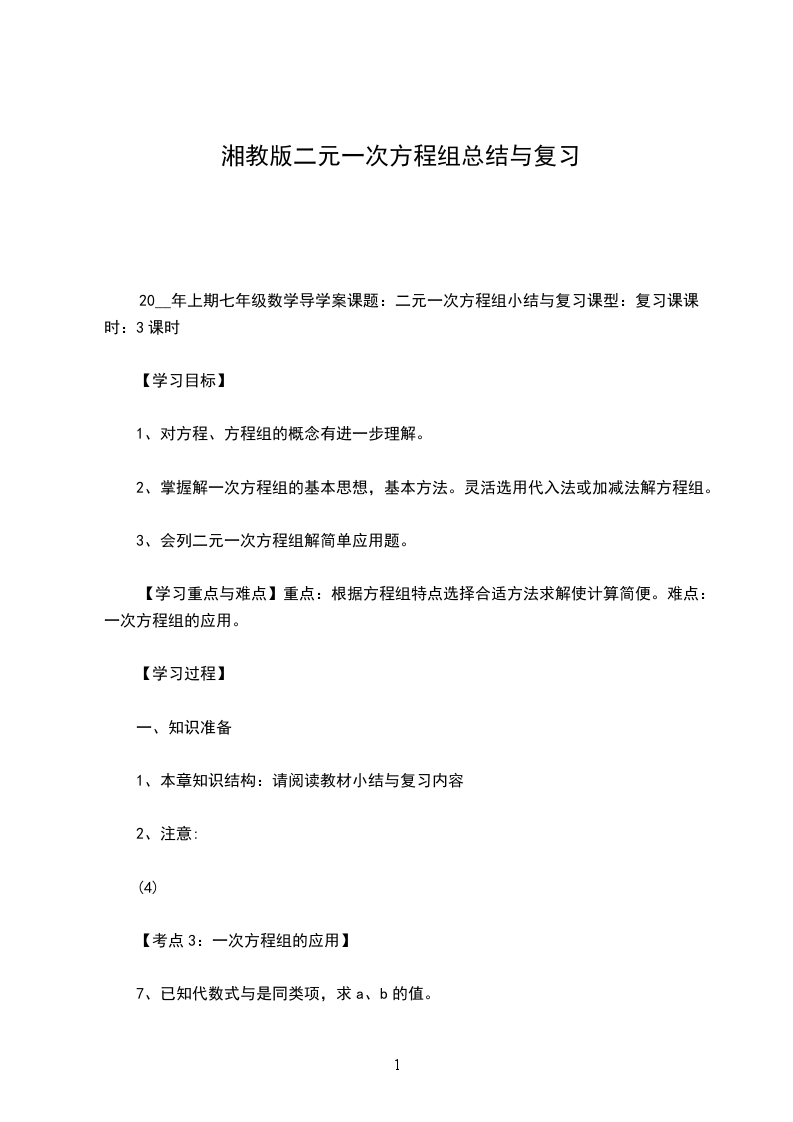 3、进一步理解消元法解方程组所表达的化归思想方法教学重点和难点进一步复习稳固解一次方程组的根本思想和根本方法,以及列一次方程组解应用题课堂教学过程设计