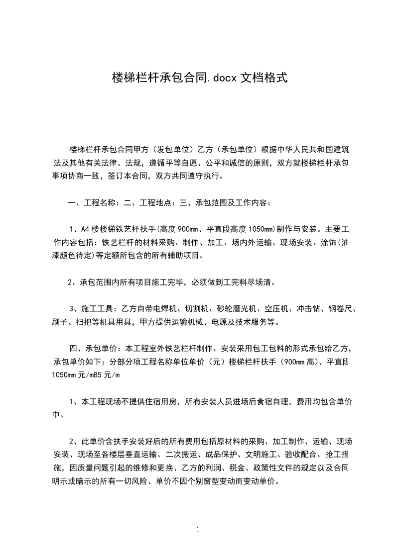 楼梯栏杆承包合同甲方(发包单位)乙方(承包单位)根据中华人民共和国建筑法及其他有关法律、法规,遵循平等自愿、公平和诚信的原则,双方就楼梯栏杆承包事项协商一致,签订本合同,双方共同遵守执行。