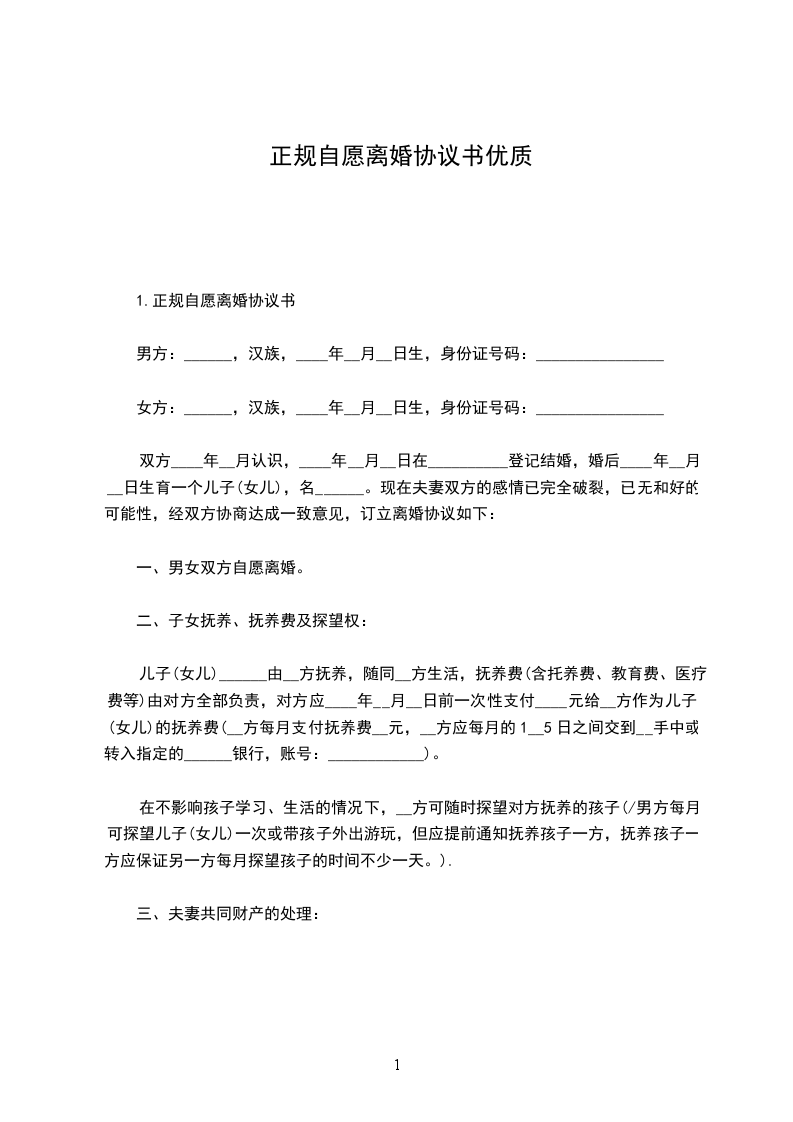 2、自愿离婚协议书协议人(男方):身份证号:协议人(女方):身份证号:协议人为明确婚前婚后双方财产所有权、债权债务承当及其他与财产权益相关的法律事宜,经双方平等自愿协商,特作如下协议: