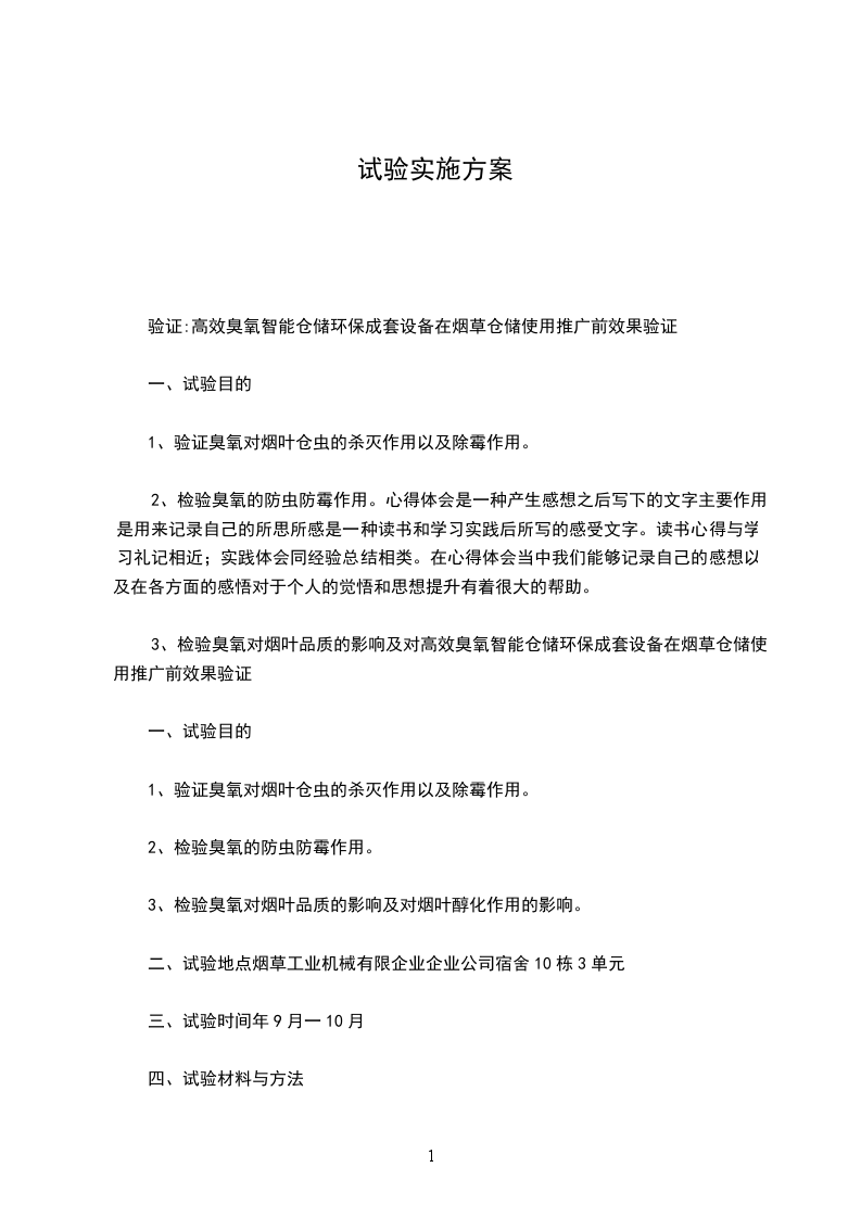 (4)检验臭氧的防虫、防霉作用以及对烟叶品质和自然醇化的影响取包装完好的片烟四包(800公斤)、把烟二包(100公斤)处理仓和依照仓各放3包。然后将处理仓和依照仓分别密封好。检查无误后参照粮食部门应用方法与浓度开机试验定期开机分别在6个月、12个月时检查烟叶长虫长霉情形与这与此同时取样进行比照评吸和化学分析。为取得准确结果以上每一个试验还必须在实仓进行烟叶样品量要大。为便于试验的进行以上每一个试验可依照实际情形安排与这与此同时进行。在试验进行过程中可依照实际情形对试验项目和实验方法进行适当改变和调整。心得体会是一种产生感想之后写下的文主要作用是用来记录自己的所思所感是一种读书和学习实践后所写的感受文_。读书心得与学习礼记相近;实践体会同经验总结相类。在心得体会当中我们能够记录自己的感想以及在各方面的感悟对于个人的觉悟和思想提升有着很大的扶助。工作总结(JobSummary/WorkSummary)以年终总结、半年总结和季度总结最为常见和多用。就其内容而言工作总结就是把一个时间段的工作进行一次全面系统的总检查、总评价、总分析、总研究并分析成绩的缺乏从而得出引以为戒的经验。总结是应用写作的一种是对已经做过的工作进行理性的思考。总结与计划是相辅相成的要以工作计划为依据订方案总是在总结经验的基础上进行的。其间有一条规律:方案一一实践一一总结一一再计划一一再实践一一再总结。