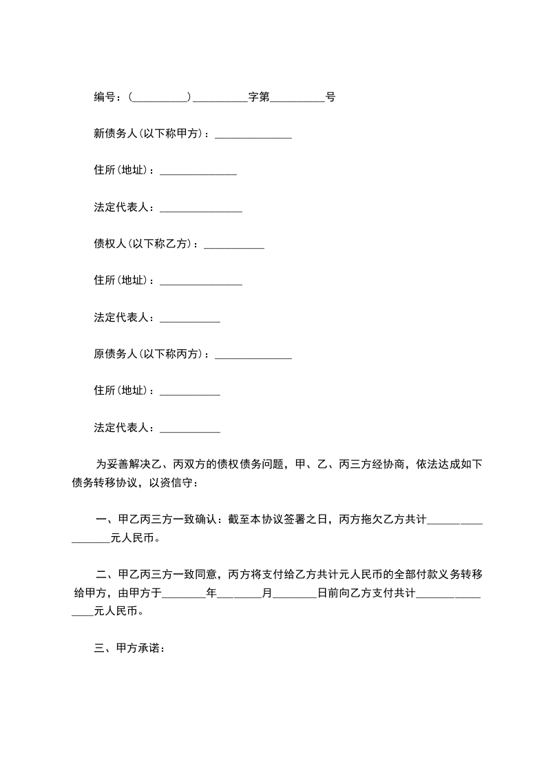 二、甲乙丙三方一致同意,丙方将支付给乙方共计元人民币的全部付款义务转移给甲方,由甲方于________年________月________日前向乙方支付共计________________元人民币。