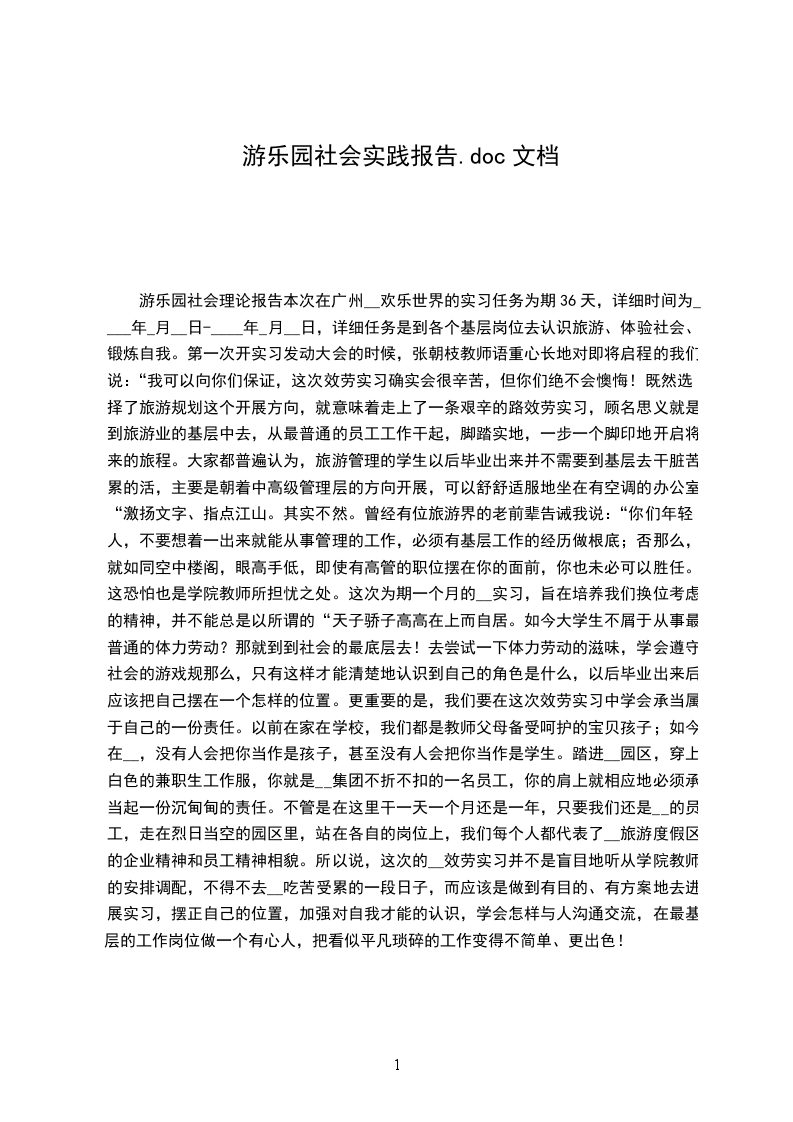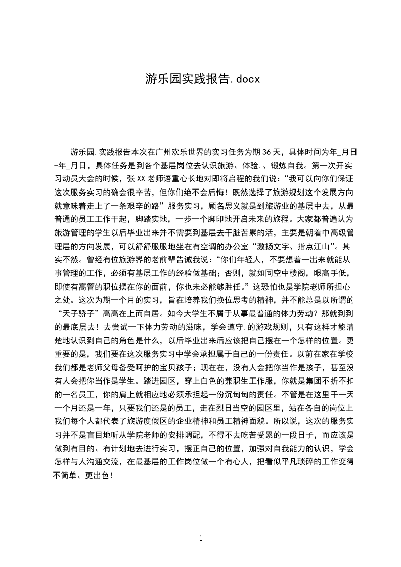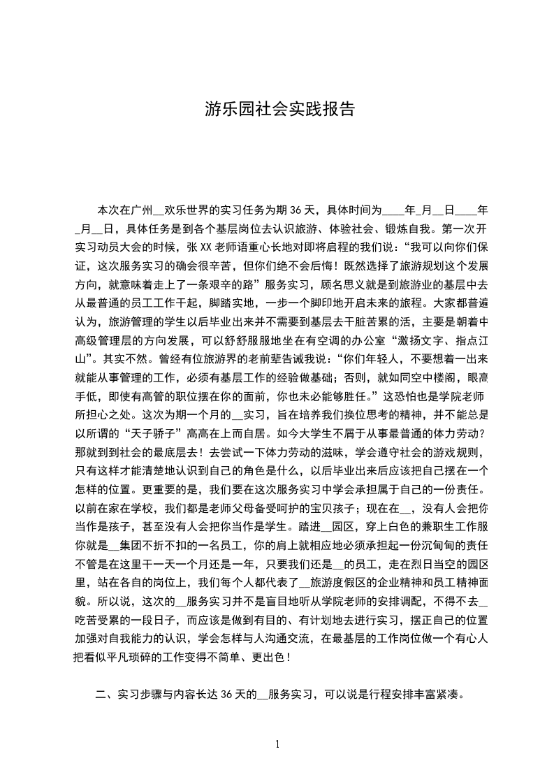 游乐园社会理论报告本次在广州__欢乐世界的实习任务为期36天,详细时间为____年_月__日-____年_月__日,详细任务是到各个基层岗位去认识旅游、体验社会、锻炼自我。第一次开实习发动大会的时候,张朝枝教师语重心长地对即将启程的我们说:“我可以向你们保证,这次效劳实习确实会很辛苦,但你们绝不会懊悔!既然选择了旅游规划这个开展方向,就意味着走上了一条艰辛的路效劳实习,顾名思义就是到旅游业的基层中去,从最普通的员工工作干起,脚踏实地,一步一个脚印地开启将来的旅程。大家都普遍认为,旅游管理的学生以后毕业出来并不需要到基层去干脏苦累的活,主要是朝着中高级管理层的方向开展,可以舒舒适服地坐在有空调的办公室“激扬文字、指点江山。其实不然。曾经有位旅游界的老前辈告诫我说:“你们年轻人,不要想着一出来就能从事管理的工作,必须有基层工作的经历做根底;否那么,就如同空中楼阁,眼高手低,即使有高管的职位摆在你的面前,你也未必可以胜任。这恐怕也是学院教师所担忧之处。这次为期一个月的__实习,旨在培养我们换位考虑的精神,并不能总是以所谓的“天子骄子高高在上而自居。如今大学生不屑于从事最普通的体力劳动?那就到到社会的最底层去!去尝试一下体力劳动的滋味,学会遵守社会的游戏规那么,只有这样才能清楚地认识到自己的角色是什么,以后毕业出来后应该把自己摆在一个怎样的位置。更重要的是,我们要在这次效劳实习中学会承当属于自己的一份责任。以前在家在学校,我们都是教师父母备受呵护的宝贝孩子;如今在__,没有人会把你当作是孩子,甚至没有人会把你当作是学生。踏进__园区,穿上白色的兼职生工作服,你就是__集团不折不扣的一名员工,你的肩上就相应地必须承当起一份沉甸甸的责任。不管是在这里干一天一个月还是一年,只要我们还是__的员工,走在烈日当空的园区里,站在各自的岗位上,我们每个人都代表了__旅游度假区的企业精神和员工精神相貌。所以说,这次的__效劳实习并不是盲目地听从学院教师的安排调配,不得不去__吃苦受累的一段日子,而应该是做到有目的、有方案地去进展实习,摆正自己的位置,加强对自我才能的认识,学会怎样与人沟通交流,在最基层的工作岗位做一个有心人,把看似平凡琐碎的工作变得不简单、更出色!