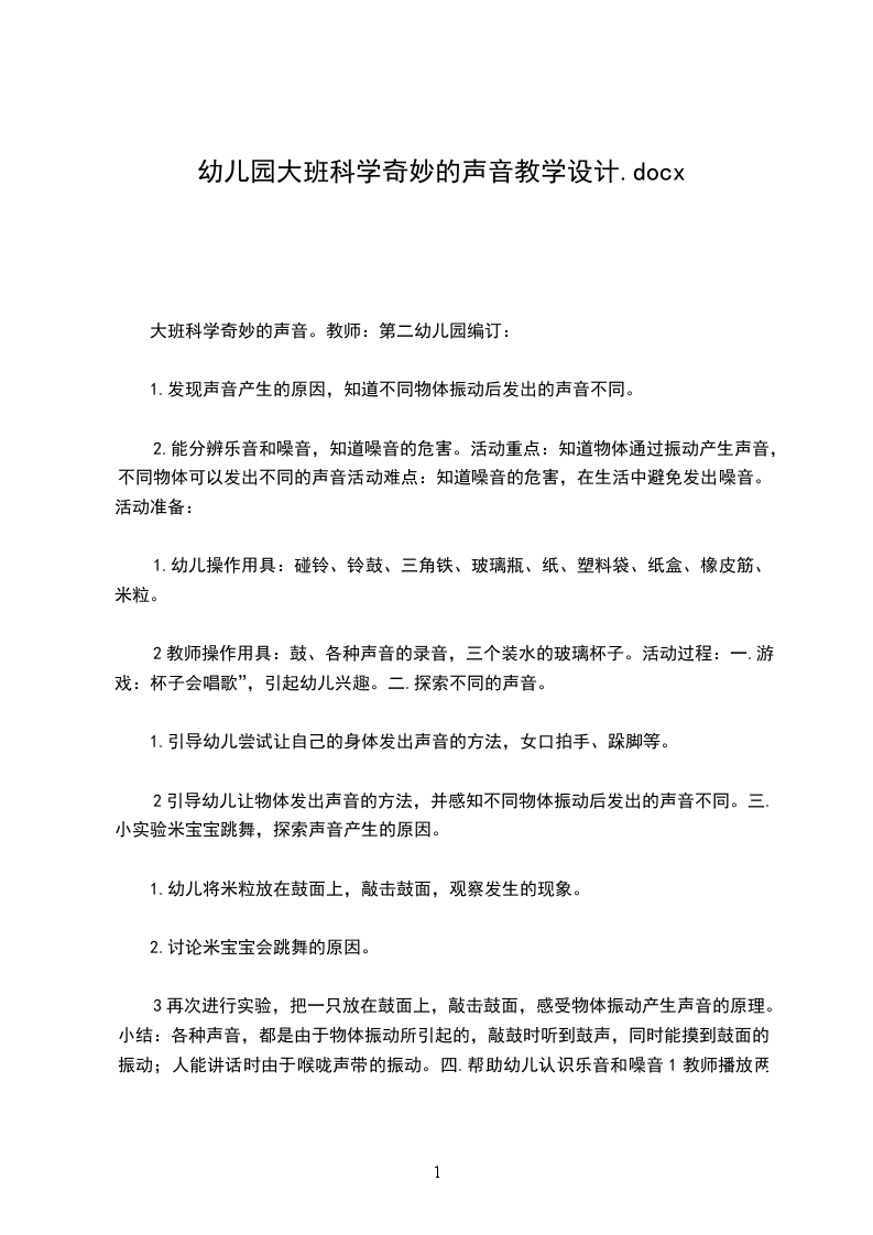 4.幼儿结合自身生活说说怎样才能避免发出噪音?五.教师总结:小朋友知道了物体振动产生了声音,不同物体发出的声音不同。好听的声音是乐音,难听的声音是噪音,今后我们要多听乐音,保护自己的耳朵,不要听噪音,自己更不能发出噪音。