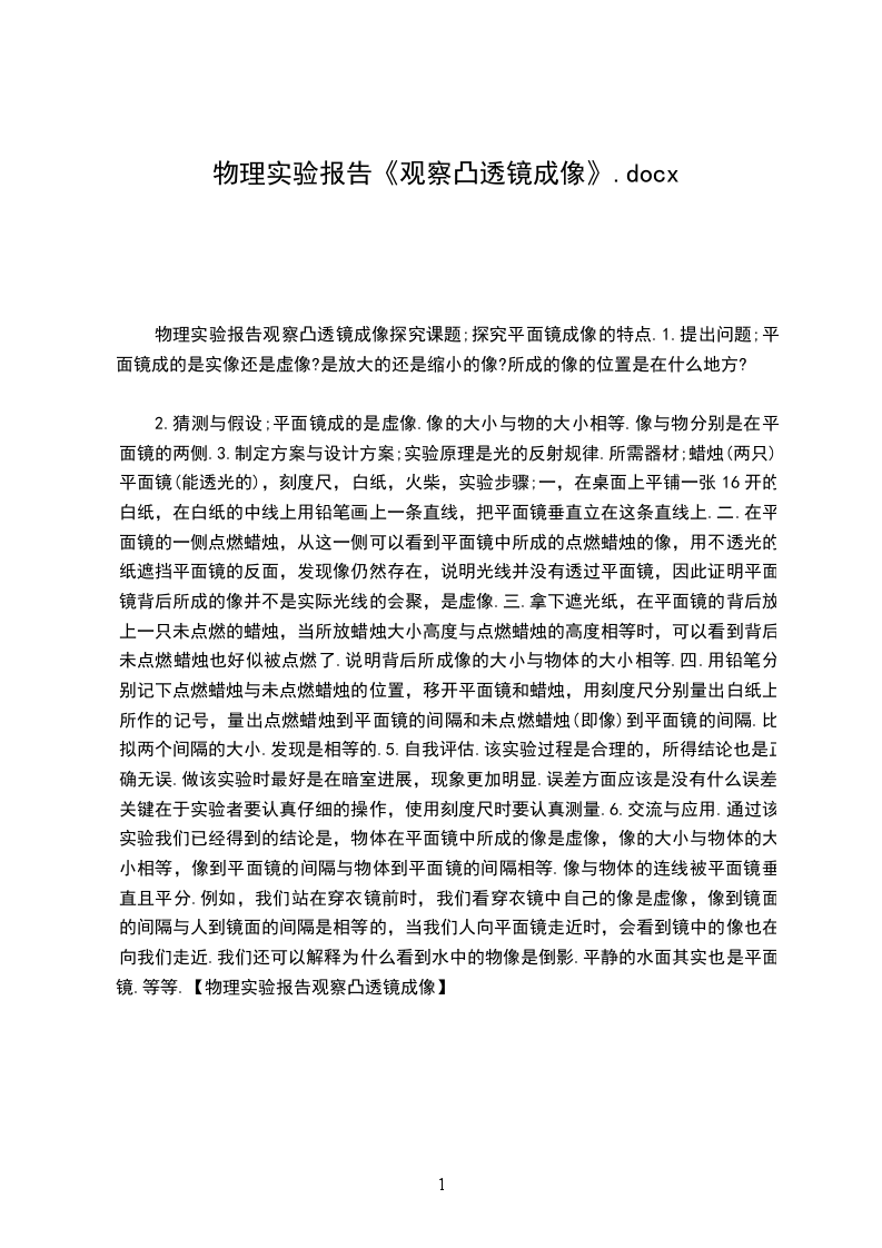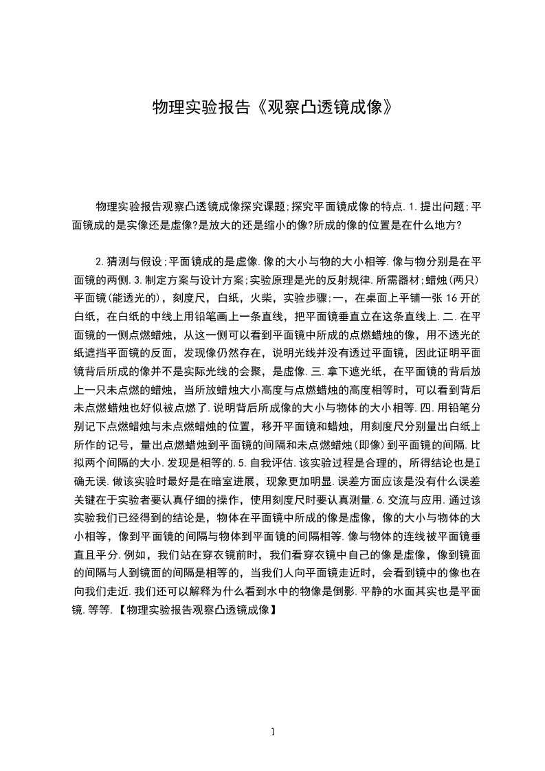 2.猜测与假设;平面镜成的是虚像.像的大小与物的大小相等.像与物分别是在平面镜的两侧.3.制定方案与设计方案;实验原理是光的反射规律.所需器材;蜡烛(两只),平面镜(能透光的),刻度尺,白纸,火柴,实验步骤;一,在桌面上平铺一张16开的白纸,在白纸的中线上用铅笔画上一条直线,把平面镜垂直立在这条直线上.二.在平面镜的一侧点燃蜡烛,从这一侧可以看到平面镜中所成的点燃蜡烛的像,用不透光的纸遮挡平面镜的反面,发现像仍然存在,说明光线并没有透过平面镜,因此证明平面镜背后所成的像并不是实际光线的会聚,是虚像.三.拿下遮光纸,在平面镜的背后放上一只未点燃的蜡烛,当所放蜡烛大小高度与点燃蜡烛的高度相等时,可以看到背后未点燃蜡烛也好似被点燃了.说明背后所成像的大小与物体的大小相等.四.用铅笔分别记下点燃蜡烛与未点燃蜡烛的位置,移开平面镜和蜡烛,用刻度尺分别量出白纸上所作的记号,量出点燃蜡烛到平面镜的间隔和未点燃蜡烛(即像)到平面镜的间隔.比拟两个间隔的大小.发现是相等的.5.自我评估.该实验过程是合理的,所得结论也是正确无误.做该实验时最好是在暗室进展,现象更加明显.误差方面应该是没有什么误差,关键在于实验者要认真仔细的操作,使用刻度尺时要认真测量.6.交流与应用.通过该实验我们已经得到的结论是,物体在平面镜中所成的像是虚像,像的大小与物体的大小相等,像到平面镜的间隔与物体到平面镜的间隔相等.像与物体的连线被平面镜垂直且平分.例如,我们站在穿衣镜前时,我们看穿衣镜中自己的像是虚像,像到镜面的间隔与人到镜面的间隔是相等的,当我们人向平面镜走近时,会看到镜中的像也在向我们走近.我们还可以解释为什么看到水中的物像是倒影.平静的水面其实也是平面镜.等等.【物理实验报告观察凸透镜成像】