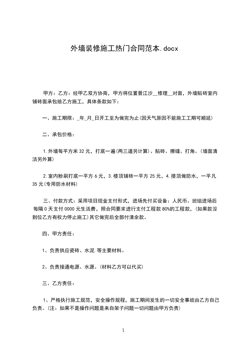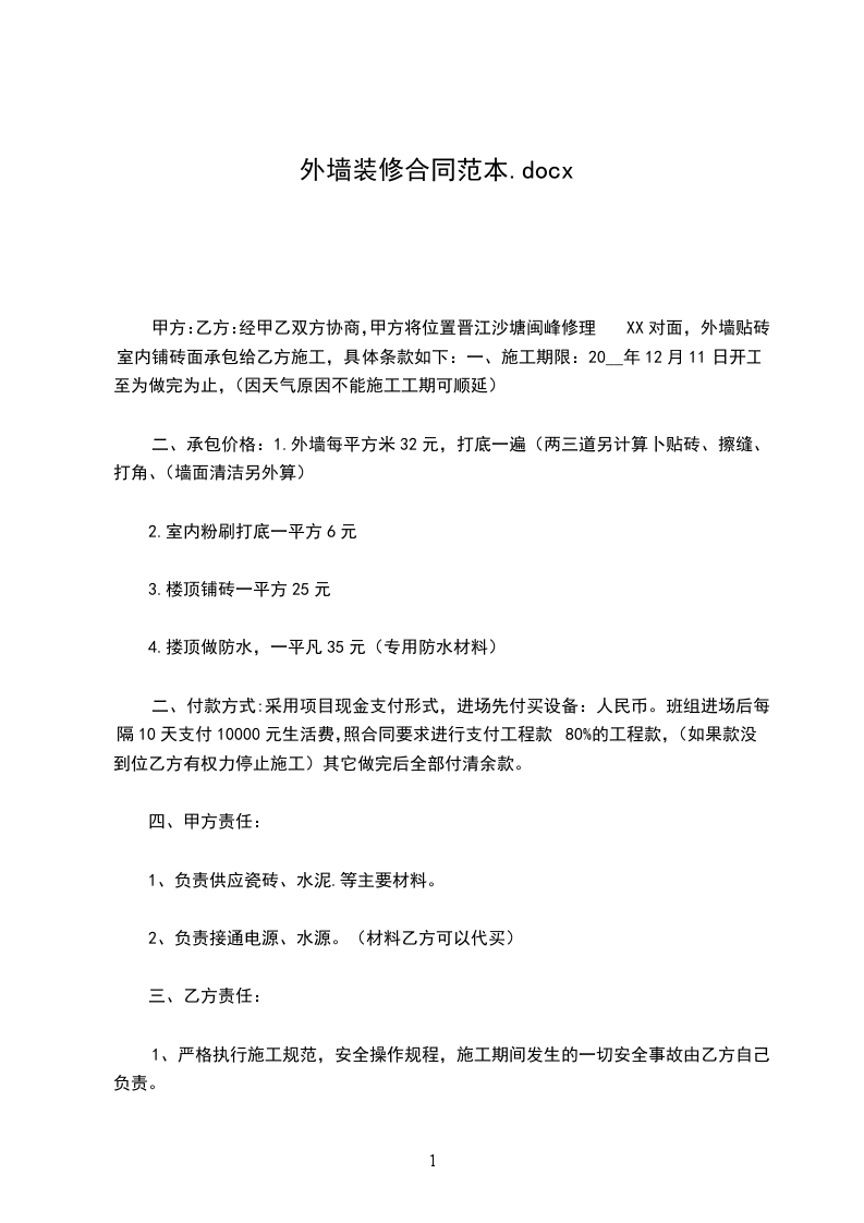 二、承包价格:1.外墙每平方米32元,打底一遍(两三道另计算卜贴砖、擦缝、打角、(墙面清洁另外算)