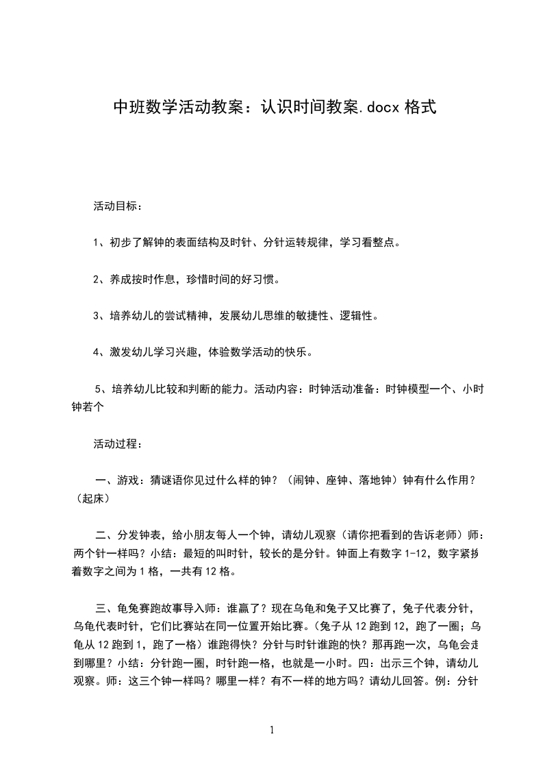 5、培养幼儿比较和判断的能力。活动内容:时钟活动准备:时钟模型一个、小时钟若个