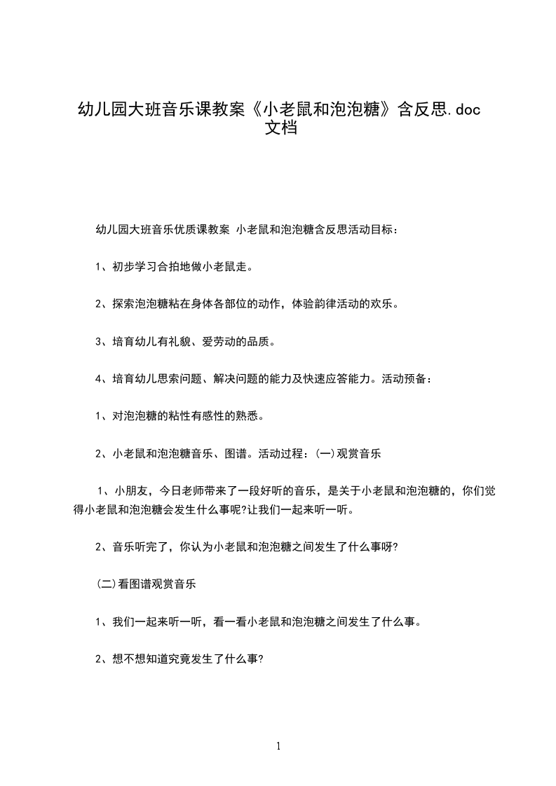 1、小朋友,今日老师带来了一段好听的音乐,是关于小老鼠和泡泡糖的,你们觉得小老鼠和泡泡糖会发生什么事呢?让我们一起来听一听。