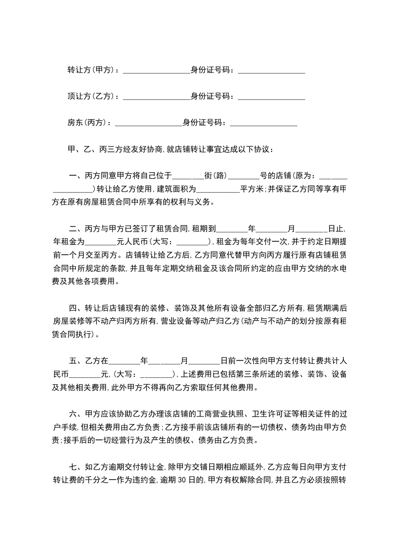 甲、乙、丙三方经友好协商,就店铺转让事宜达成以下协议:
