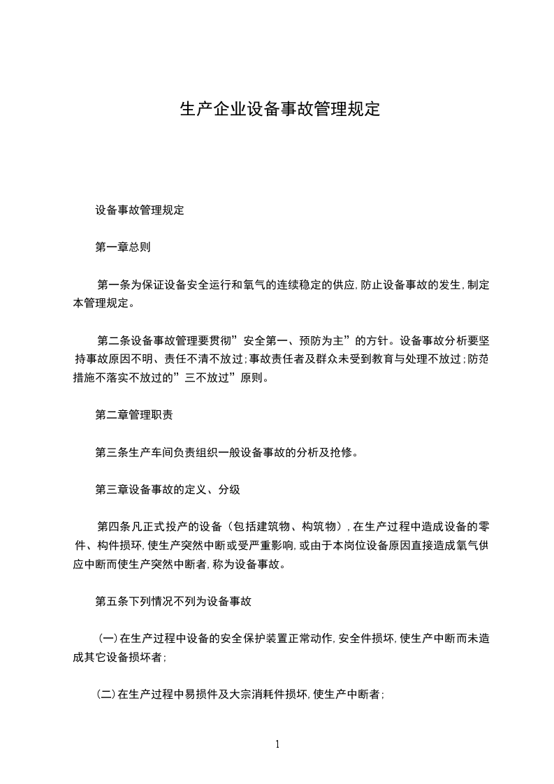 第四条凡正式投产的设备(包括建筑物、构筑物),在生产过程中造成设备的零件、构件损环,使生产突然中断或受严重影响,或由于本岗位设备原因直接造成氧气供应中断而使生产突然中断者,称为设备事故。