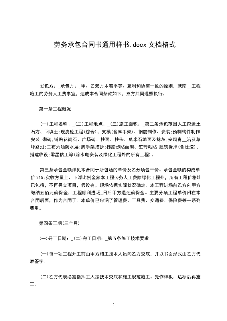 发包方:_承包方:_甲、乙双方本着平等、互利和协商一致的原则,就南__工程施工的劳务人工费事宜,达成本合同条款如下,双方共同遵照执行。