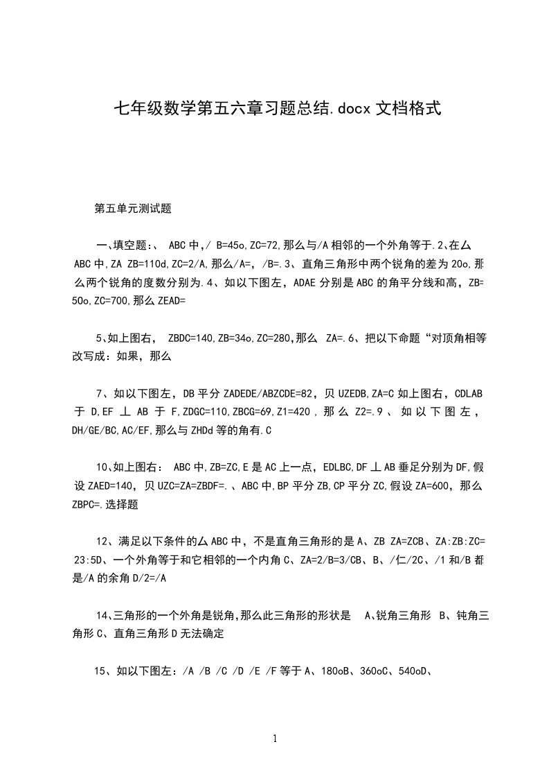 一、填空题:、ABC中,/B=45o,ZC=72,那么与/A相邻的一个外角等于.2、在厶ABC中,ZA ZB=110d,ZC=2/A,那么/A=,/B=.3、直角三角形中两个锐角的差为20o,那么两个锐角的度数分别为.4、如以下图左,ADAE分别是ABC的角平分线和高,ZB=5Oo,ZC=700,那么ZEAD=