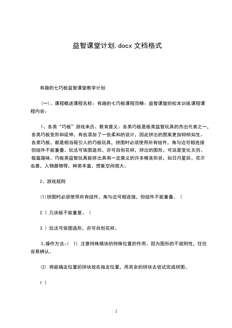 (一)、课程概述课程名称:有趣的七巧板课程范畴:益智课堂的校本训练课程课程内容: