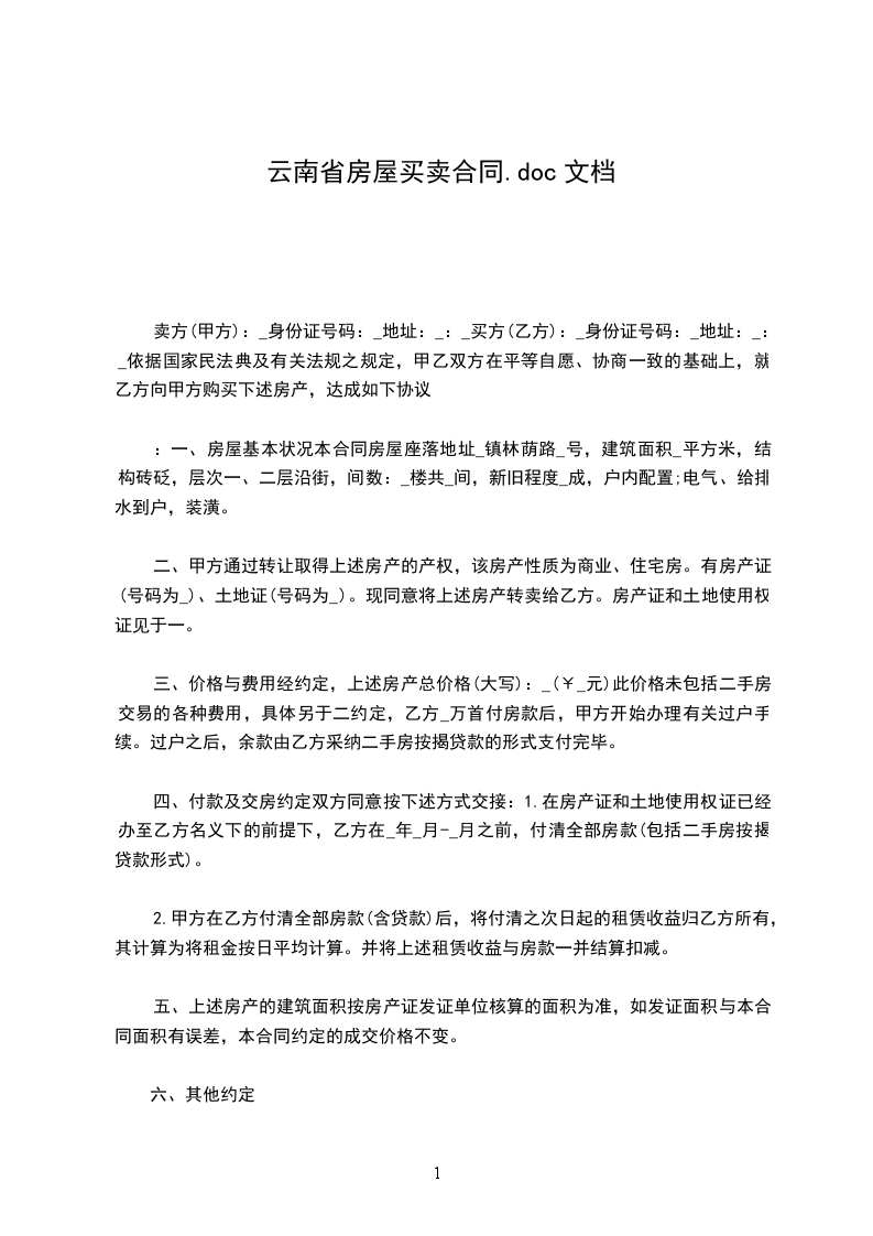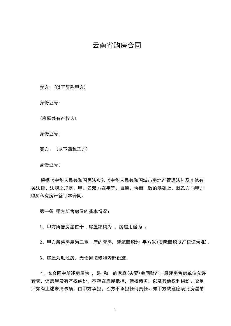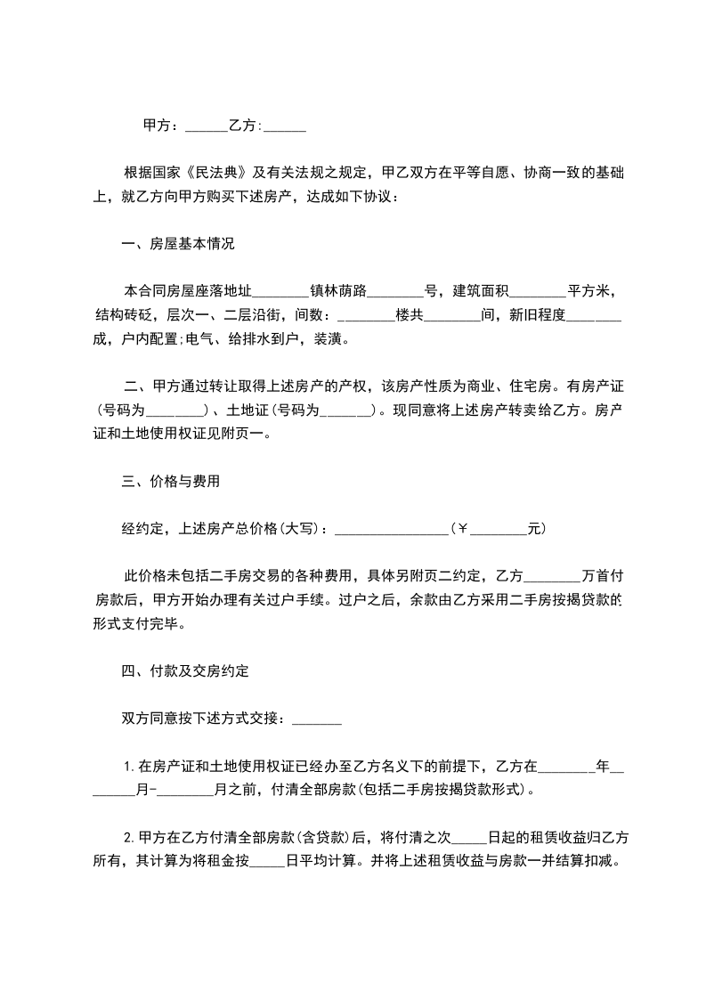 卖方(甲方):_身份证号码:_地址:_:_买方(乙方):_身份证号码:_地址:_:_依据国家民法典及有关法规之规定,甲乙双方在平等自愿、协商一致的基础上,就乙方向甲方购买下述房产,达成如下协议