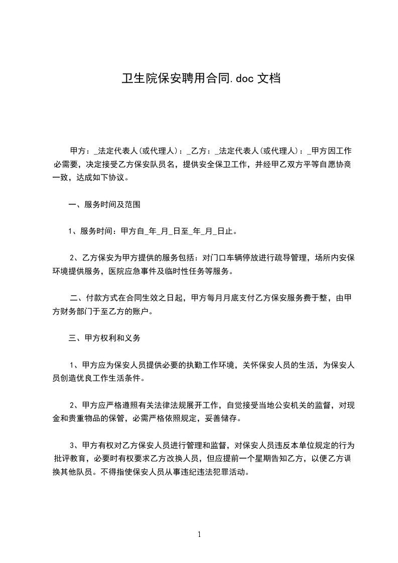 甲方:_法定代表人(或代理人):_乙方:_法定代表人(或代理人):_甲方因工作必需要,决定接受乙方保安队员名,提供安全保卫工作,并经甲乙双方平等自愿协商一致,达成如下协议。