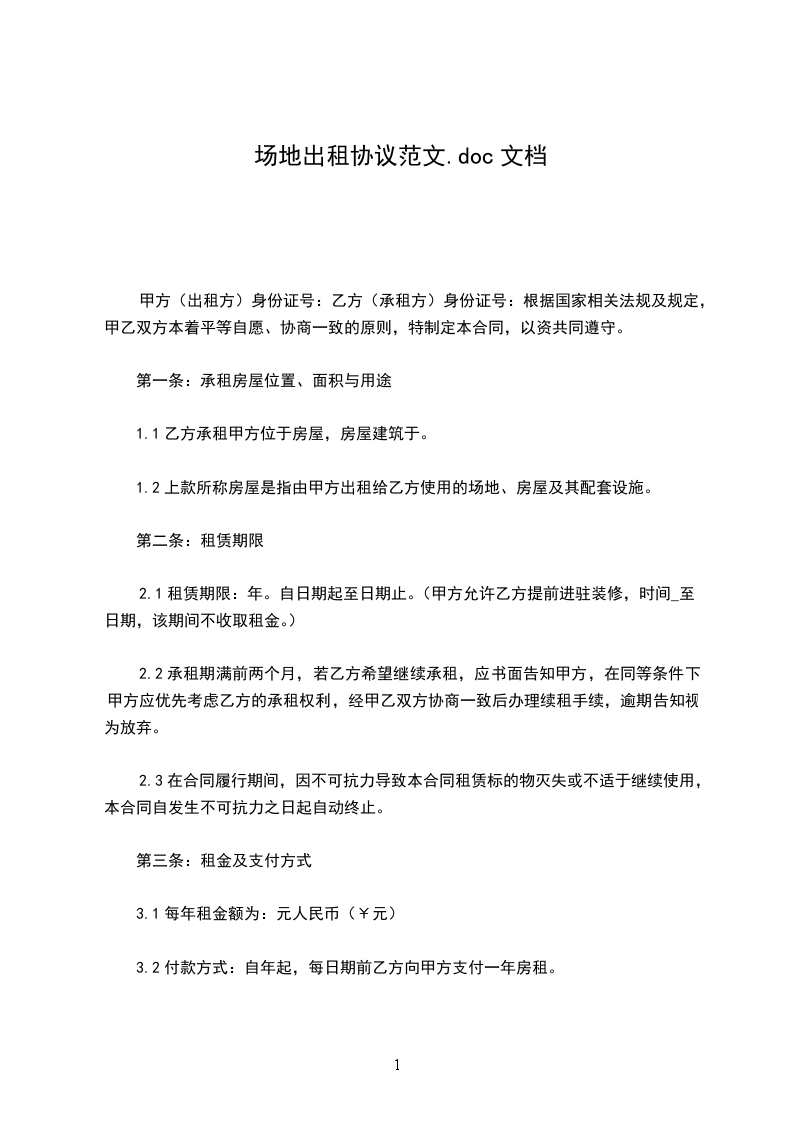 甲方(出租方)身份证号:乙方(承租方)身份证号:根据国家相关法规及规定,甲乙双方本着平等自愿、协商一致的原则,特制定本合同,以资共同遵守。