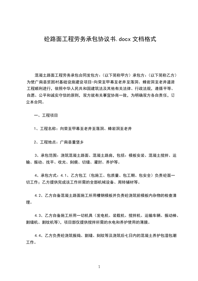 混凝土路面工程劳务承包合同发包方:(以下简称甲方)承包方:(以下简称乙方)为使广南县贫困村基础设施建设项目-向荣至甲幕至老井至落洞、蜂岩洞至老井道路工程顺利进行,依照中华人民共和国建筑法及其他有关法律、行政法规,遵循平等、自愿、公平和诚实守信的原则,双方就有关事宜协商一致,为明确双方各自责任,订立本合同。