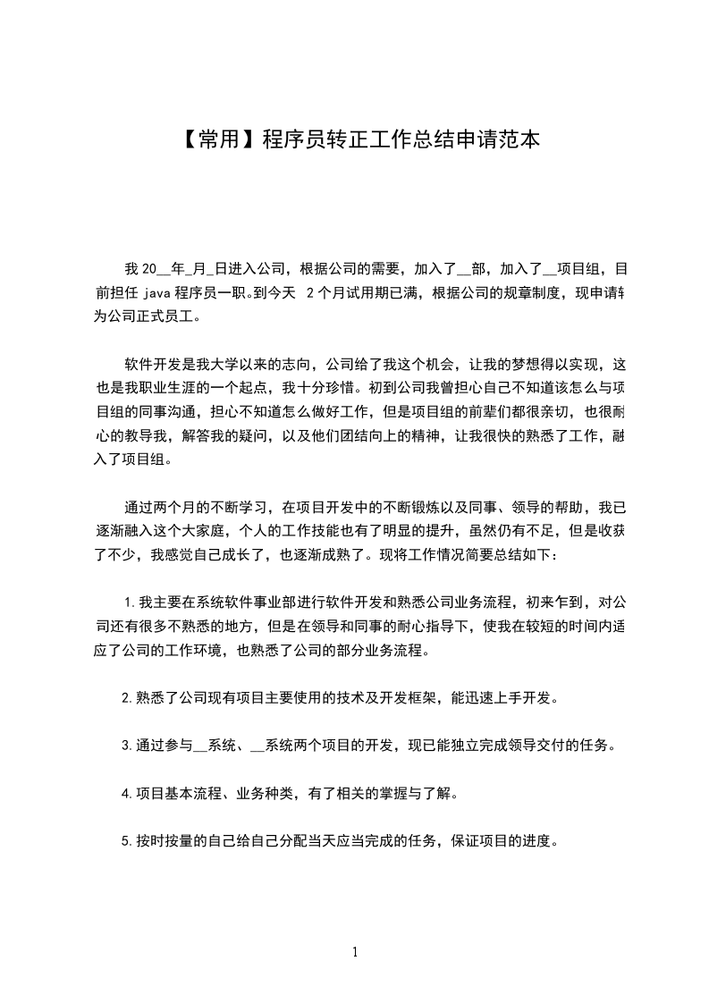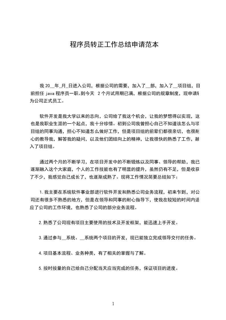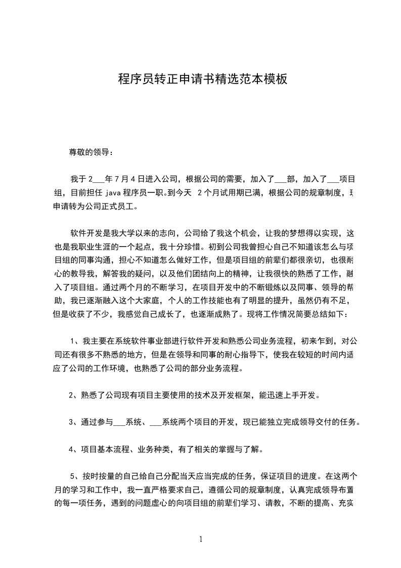 3.__系统修改等待确认公司融洽的工作氛围、团结向上的企业文化,让我很快进入到了工作角色中来。在公司的领导下,我会更加严格要求自己,在作好本职工作的同时,积极团结同事,搞好大家之间的关系。在工作中,不断的学习与积累,不断完善自我,使工作能够更快、更好的完成。我相信我一定会做好工作,不辜负领导对我的期望。在这三个月的工作中,我的技术水平,和业务能力都有所很大提高,和公司每位同事相处融洽,工作有条不紊。我深深体会到有一个和谐、共进的团队是非常重要的,有一个积极向上、大气磅礴的公司和领导是员工前进的动力。___公司给了我这样一个发挥的舞台,我会好好珍惜这次机会,为公司的发展竭尽全力。在此我提出转正申请,希望自己能成为公司的正式员工,恳请领导予以批准。此致敬礼申请人:____20__年_月_日2尊敬的领导:我于20__年7月4日进入公司,根据公司的需要,加入了___部,加入了___项目组,目前担任java程序员一职。到今天2个月试用期已满,根据公司的规章制度,现申请转为公司正式员工。软件开发是我大学以来的志向,公司给了我这个机会,让我的梦想得以实现,这也是我职业生涯的一个起点,我十分珍惜。初到公司我曾担心自己不知道该怎么与项目组的同事沟通,担心不知道怎么做好工作,但是项目组的前辈们都很亲切,也很耐心的教导我,解答我的疑问,以及他们团结向上的精神,让我很快的熟悉了工作,融入了项目组。通过两个月的不断学习,在项目开发中的不断锻炼以及同事、领导的帮助,我已逐渐融入这个大家庭,个人的工作技能也有了明显的提升,虽然仍有不足,但是收获了不少,我感觉自己成长了,也逐渐成熟了。现将工作情况简要总结如下:1.我主要在系统软件事业部进行软件开发和熟悉公司业务流程,初来乍到,对公司还有很多不熟悉的地方,但是在领导和同事的耐心指导下,使我在较短的时间内适应了公司的工作环境,也熟悉了公司的部分业务流程。