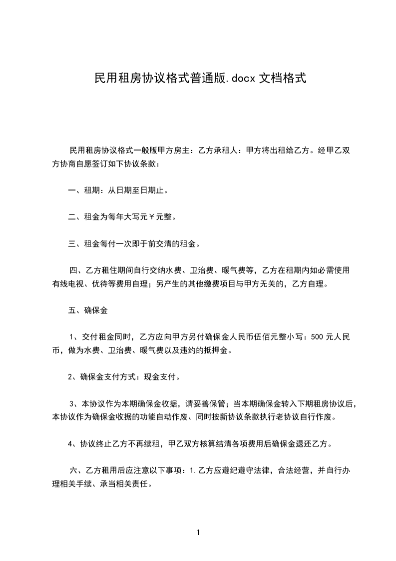 民用租房协议格式一般版甲方房主:乙方承租人:甲方将出租给乙方。经甲乙双方协商自愿签订如下协议条款: