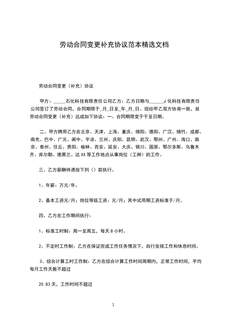 甲方:_____石化科技有限责任公司乙方:乙方日期与______J化科技有限责任公司签订了劳动合同,合同期限于_月_日至_年_月_日。现经甲乙双方协商一致,就劳动合同变更(补充)达成如下协议:一、合同期限变于于至日期。