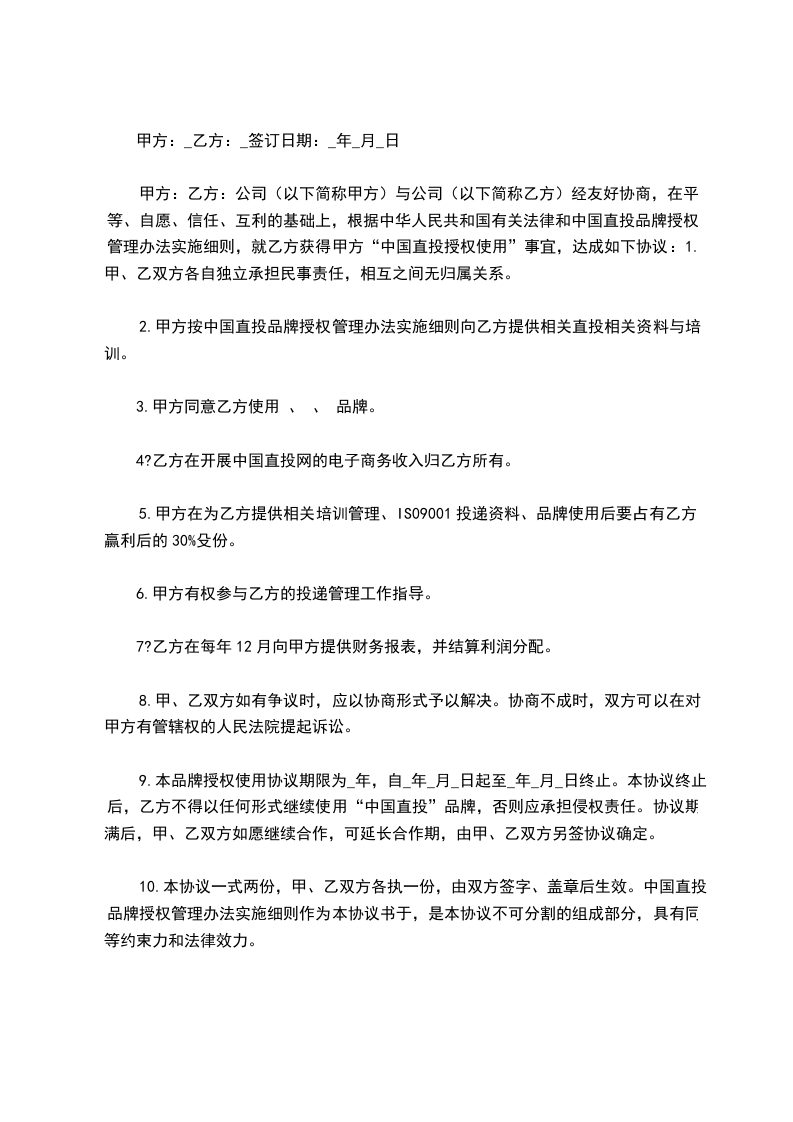甲方:乙方:公司(以下简称甲方)与公司(以下简称乙方)经友好协商,在平等、自愿、信任、互利的基础上,根据中华人民共和国有关法律和中国直投品牌授权管理办法实施细则,就乙方获得甲方“中国直投授权使用”事宜,达成如下协议:1.甲、乙双方各自独立承担民事责任,相互之间无归属关系。