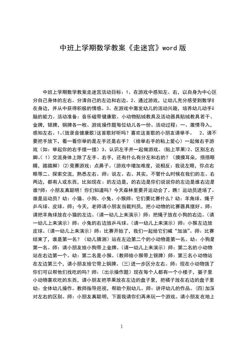二..引导幼儿复习了解走迷宫的方法1.出示迷宫图,让幼儿感受迷宫的结构,让幼儿数一下一共有几条路2.请幼儿上来先找一下入口和出口,再试着走迷宫3老师在幼儿尝试的过程中启发幼儿了解走数字迷宫的要求4.带领幼儿分析遇到岔路口高如何进行选择5.根据方法检查幼儿是否走正确三,分组操作1教师介绍不同的迷宫图让幼儿根据兴趣进行选择。老师讲解活动内容和玩法2.幼儿分组操作教师巡视指导,重点指导能力较差的小组二交流归纳1.展示结果,小组间相互交流检查2.展示个别幼儿的作业。3集体讨论修正三讨论归纳走迷宫的方法教学反思在整个教学活动中孩子们都以极高的兴趣在进行参与,通过活动幼儿能较好的掌握走迷宫的一般方法,并且能正确的找到路线,在整个活动中孩子们有极大的自由操作的空间和时间,并且在此过程中组内成员间学会了互相交流讨论在此过程中孩子们获得了极大的满足感和成功感,空间智能也得到了提高。如果在重新上这节课,我会让孩子们尝试自己设计迷宫在和孩子们一起搭建迷宫并且培养幼儿学会检查。