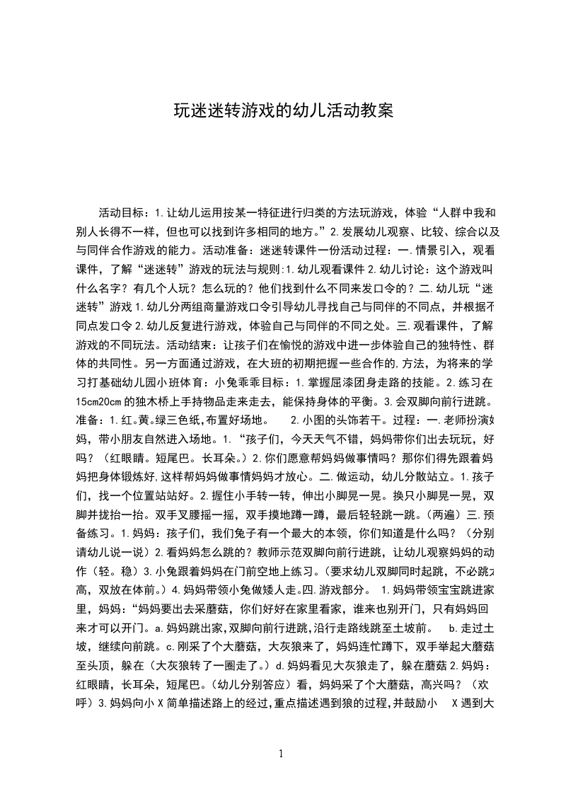 活动目标1.喜欢走迷宫体会成功的喜悦。2.掌握走迷宫的一般方法,学会检查。3.考验小朋友们的反应能力,锻炼他们的个人能力。4.在活动中,让幼儿体验与同伴共游戏的快乐,乐意与同伴一起游戏。5.通过活动幼儿学会游戏,感受游戏的乐趣。教学重点、难点1.幼儿会认读数字1-7.2.幼儿用书,不同大的迷宫图各一张活动准备1.让幼儿复习数数2.将幼儿进行分组活动过程一感知了解一.接示课题。引发兴趣