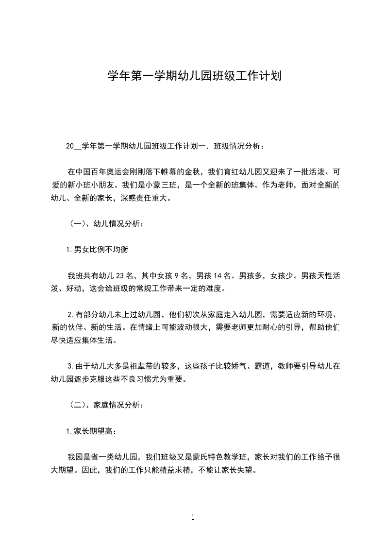 20__学年第一学期幼儿园班级工作计划一.班级情况分析: