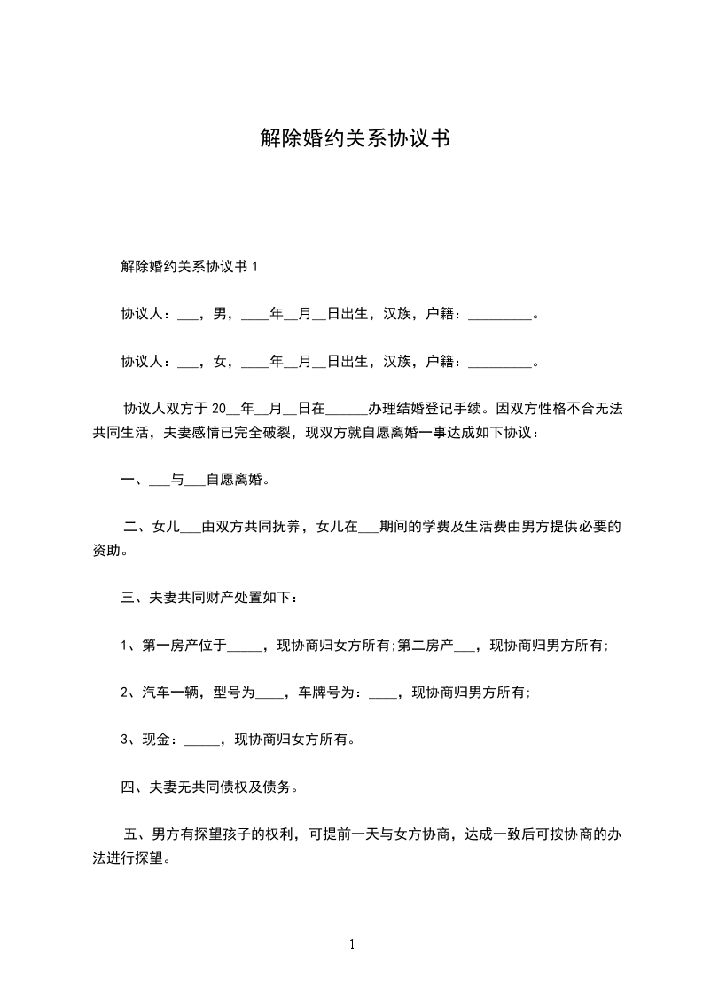 女方:__,女,汉族,_年_月_日生,住____________,身份证号码:_______________男方与女方于_年_月认识,于_年_月_日在_登记结婚,婚后于_年_月_日生育一儿子/女儿,名_。因_致使夫妻感情确已破裂,已无和好可能,现经夫妻双方自愿协商达成一致意见,订立离婚协议如下:
