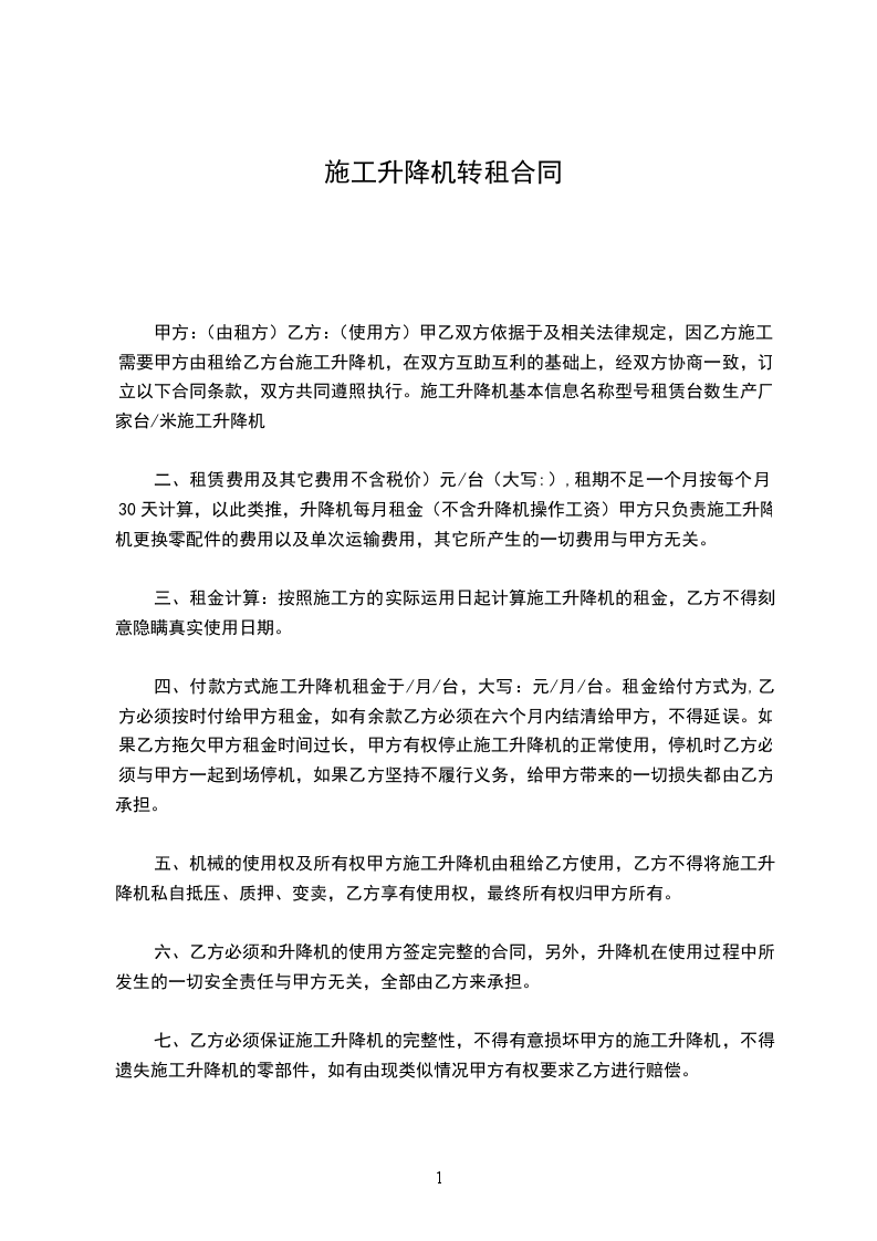 六、乙方必须和升降机的使用方签定完整的合同,另外,升降机在使用过程中所发生的一切安全责任与甲方无关,全部由乙方来承担。