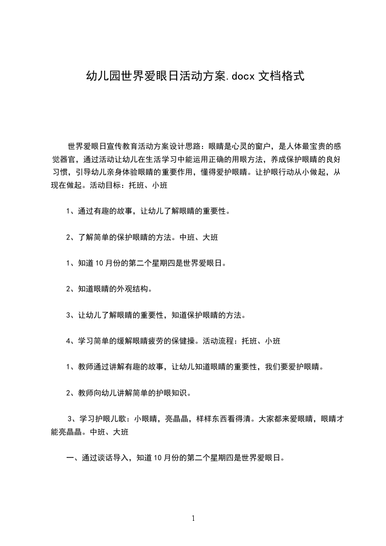世界爱眼日宣传教育活动方案设计思路:眼睛是心灵的窗户,是人体最宝贵的感觉器官,通过活动让幼儿在生活学习中能运用正确的用眼方法,养成保护眼睛的良好习惯,引导幼儿亲身体验眼睛的重要作用,懂得爱护眼睛。让护眼行动从小做起,从现在做起。活动目标:托班、小班