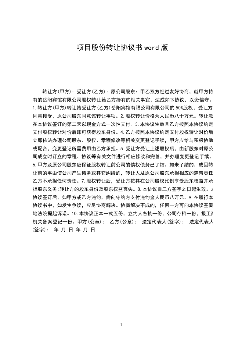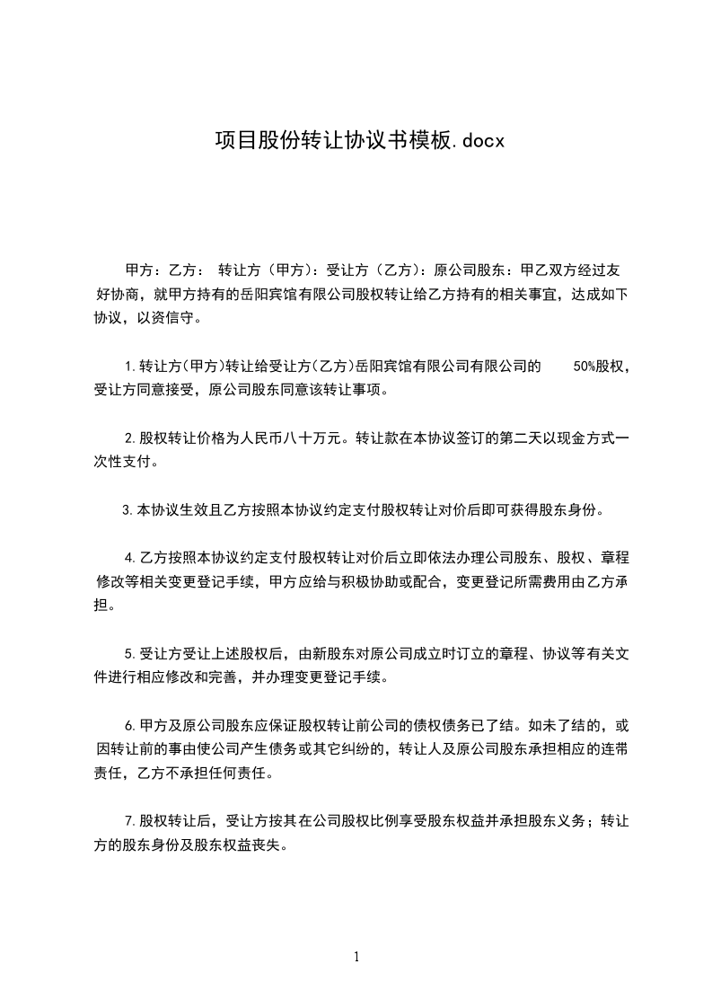 1.转让方(甲方)转让给受让方(乙方)岳阳宾馆有限公司有限公司的50%股权,受让方同意接受,原公司股东同意该转让事项。