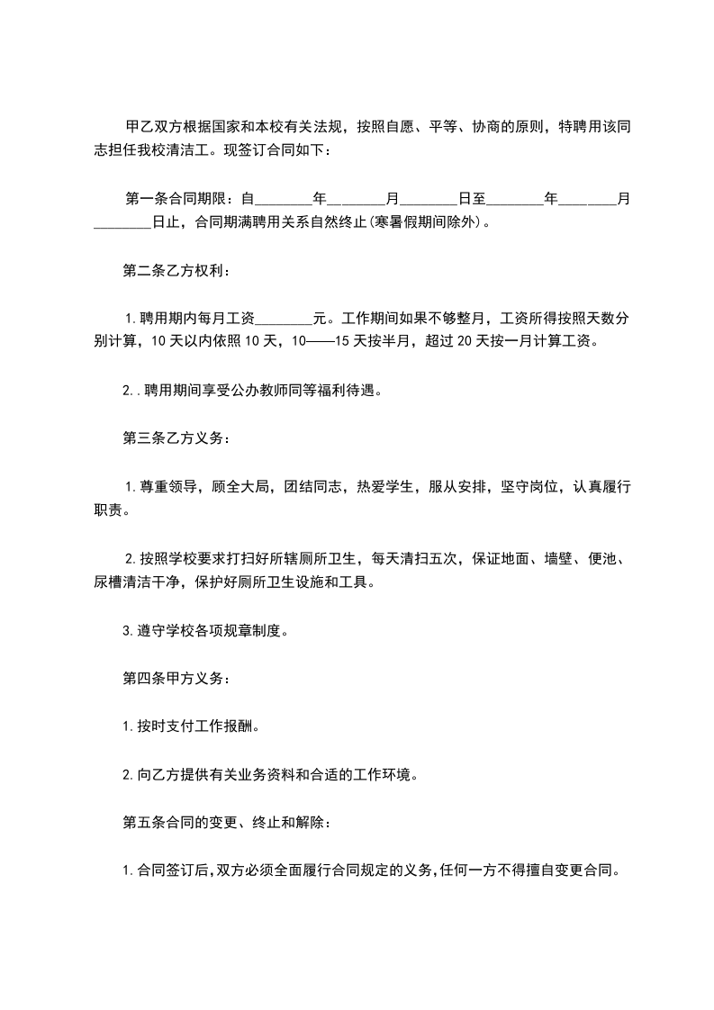 甲乙双方根据国家和本校有关法规,按照自愿、平等、协商的原则,特聘用该同志担任我校清洁工。现签订合同如下: