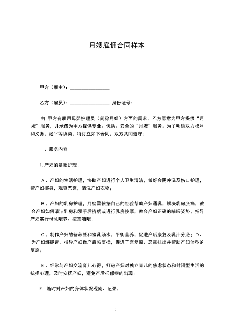 由于________________(甲方)有雇用母婴护理员(简称月嫂)方面的需求,________________(乙方)愿意为甲方提供月嫂服务,并承诺为甲方提供专业、优质、安全的月嫂服务。为了明确双方权利和义务,经平等协商,特订立如下合同,双方共同遵守: