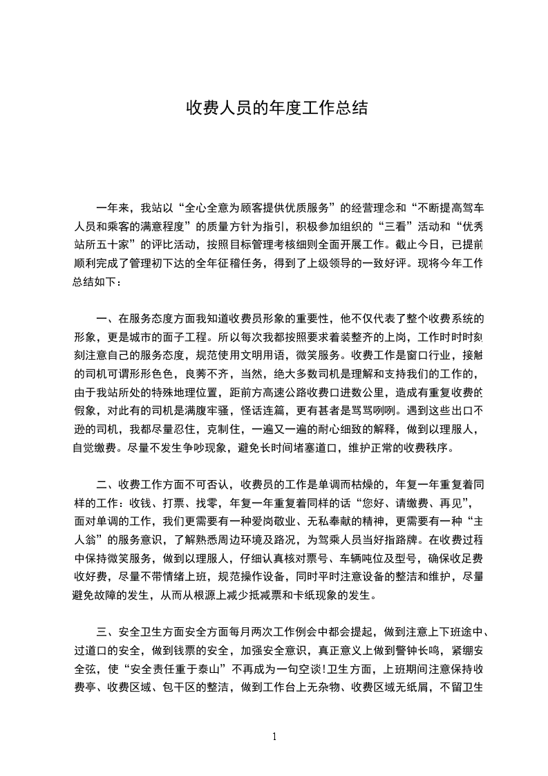 三、安全卫生方面安全方面每月两次工作例会中都会提起,做到注意上下班途中、过道口的安全,做到钱票的安全,加强安全意识,真正意义上做到警钟长鸣,紧绷安全弦,使“安全责任重于泰山”不再成为一句空谈!卫生方面,上班期间注意保持收费亭、收费区域、包干区的整洁,做到工作台上无杂物、收费区域无纸屑,不留卫生死角。__年是充满挑战的一年,也是收获的一年,我们在取得成绩的同时,也存在着许多需要改进的地方,在新的一年即将到来之际,我将总结经验,克服不足,力争在明年更上一个新的台阶!