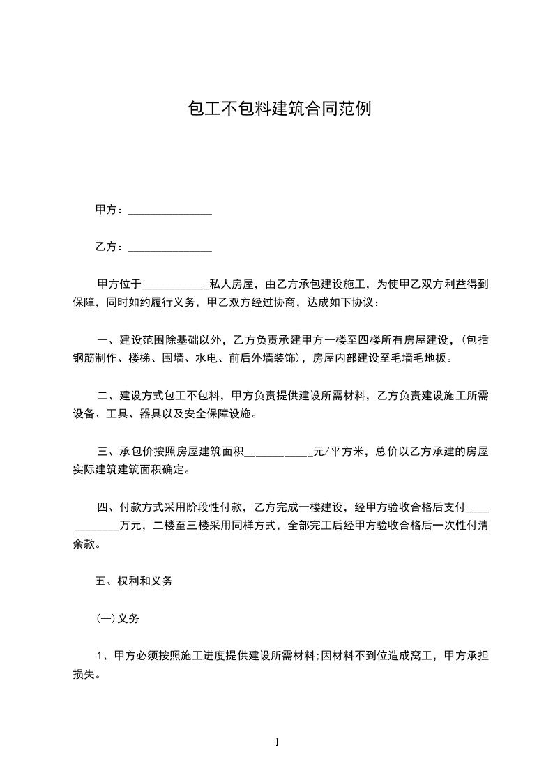 二、建设方式包工不包料,甲方负责提供建设所需材料,乙方负责建设施工所需设备、工具、器具以及安全保障设施。