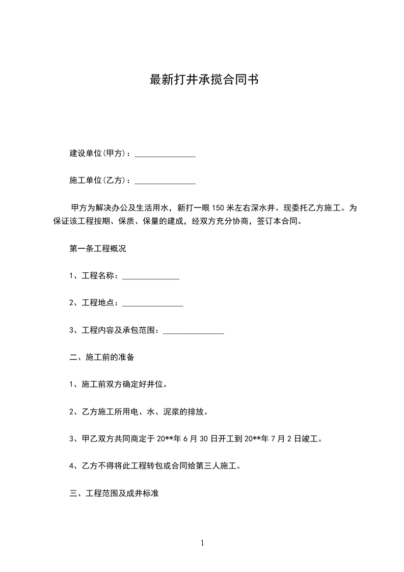 甲方为解决办公及生活用水,新打一眼150米左右深水井。现委托乙方施工。为保证该工程按期、保质、保量的建成,经双方充分协商,签订本合同。
