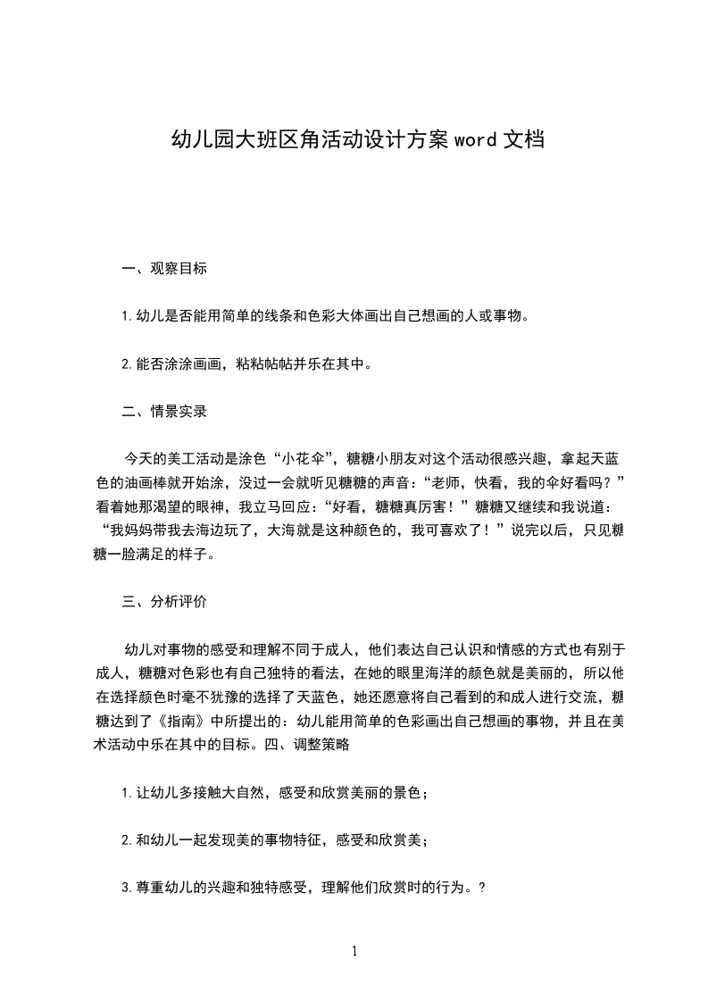 幼儿对事物的感受和理解不同于成人,他们表达自己认识和情感的方式也有别于成人,糖糖对色彩也有自己独特的看法,在她的眼里海洋的颜色就是美丽的,所以他在选择颜色时毫不犹豫的选择了天蓝色,她还愿意将自己看到的和成人进行交流,糖糖达到了《指南》中所提出的:幼儿能用简单的色彩画出自己想画的事物,并且在美术活动中乐在其中的目标。四、调整策略