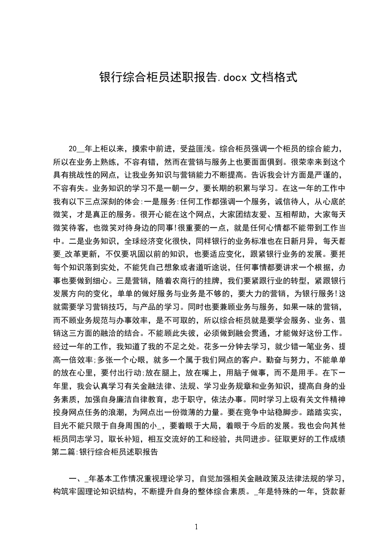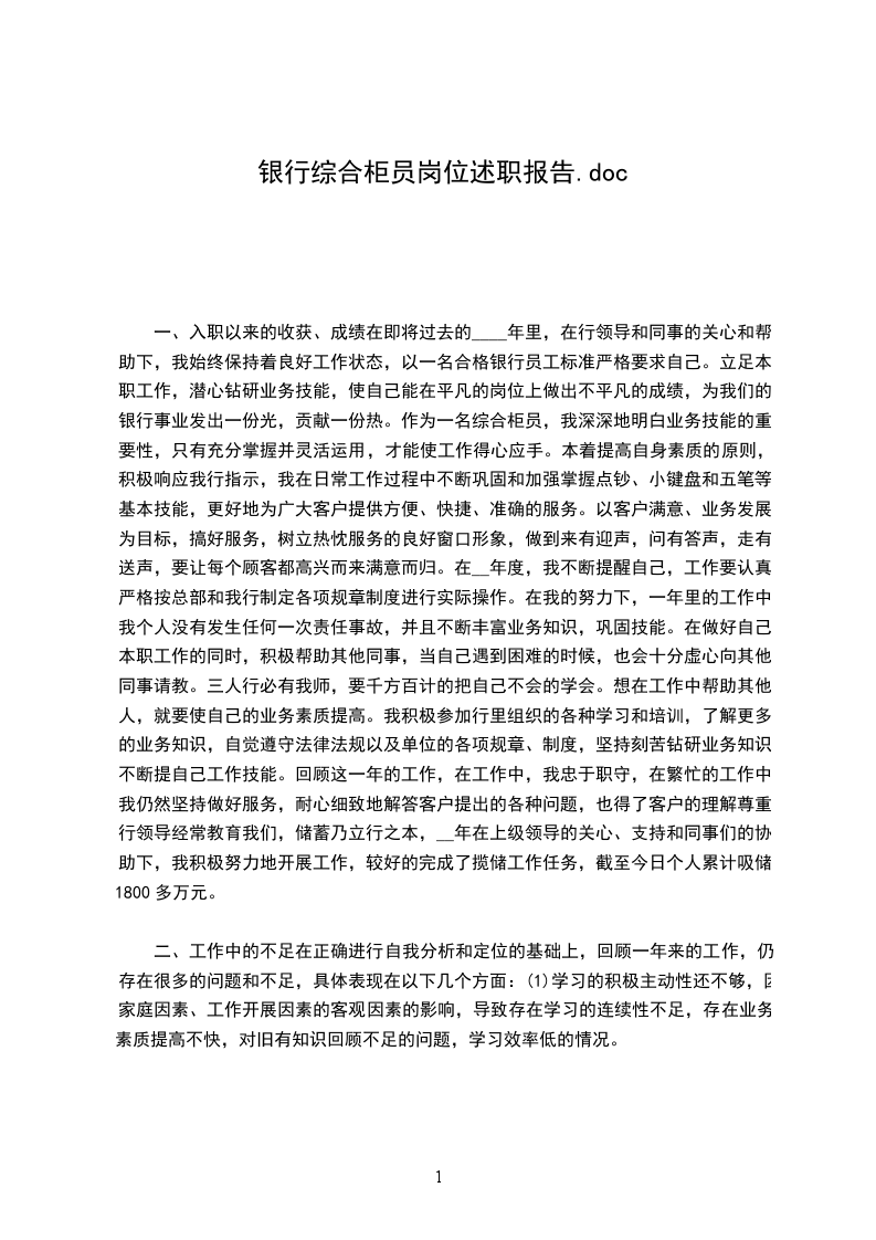 20__年上柜以来,摸索中前进,受益匪浅。综合柜员强调一个柜员的综合能力,所以在业务上熟练,不容有错,然而在营销与服务上也要面面俱到。很荣幸来到这个具有挑战性的网点,让我业务知识与营销能力不断提高。告诉我会计方面是严谨的,不容有失。业务知识的学习不是一朝一夕,要长期的积累与学习。在这一年的工作中,我有以下三点深刻的体会:一是服务:任何工作都强调一个服务,诚信待人,从心底的微笑,才是真正的服务。很开心能在这个网点,大家团结友爱、互相帮助,大家每天微笑待客,也微笑对待身边的同事!很重要的一点,就是任何心情都不能带到工作当中。二是业务知识,全球经济变化很快,同样银行的业务标准也在日新月异,每天都要_改革更新,不仅要巩固以前的知识,也要适应变化,跟紧银行业务的发展。要把每个知识落到实处,不能凭自己想象或者道听途说,任何事情都要讲求一个根据,办事也要做到细心。三是营销,随着农商行的挂牌,我们要紧跟行业的转型,紧跟银行发展方向的变化,单单的做好服务与业务是不够的,要大力的营销,为银行服务!这就需要学习营销技巧,与产品的学习。同时也要兼顾业务与服务,如果一味的营销,而不顾业务规范与办事效率,是不可取的,所以综合柜员就是要学会服务、业务、营销这三方面的融洽的结合。不能顾此失彼,必须做到融会贯通,才能做好这份工作。经过一年的工作,我知道了我的不足之处。花多一分钟去学习,就少错一笔业务、提高一倍效率;多张一个心眼,就多一个属于我们网点的客户。勤奋与努力,不能单单的放在心里,要付出行动;放在腿上,放在嘴上,用脑子做事,而不是用手。在下一年里,我会认真学习有关金融法律、法规、学习业务规章和业务知识,提高自身的业务素质,加强自身廉洁自律教育,忠于职守,依法办事。同时学习上级有关文件精神。投身网点任务的浪潮,为网点出一份微薄的力量。要在竞争中站稳脚步。踏踏实实,目光不能只限于自身周围的小_,要着眼于大局,着眼于今后的发展。我也会向其他柜员同志学习,取长补短,相互交流好的工和经验,共同进步。征取更好的工作成绩。第二篇:银行综合柜员述职报告