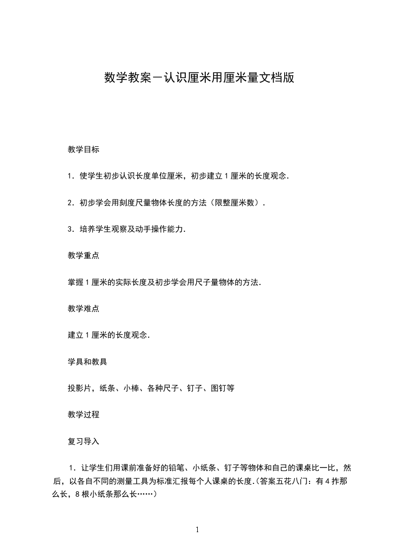 1.在实践活动中,认识长度单位厘米,初步建立1厘米的长度观念。