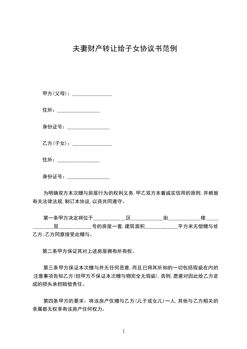 第一条甲方决定将位于_____________区_____________街_____________楼_____________层_____________号的房屋一套,建筑面积_____________平方米无偿赠与给乙方;乙方同意接受此赠与。