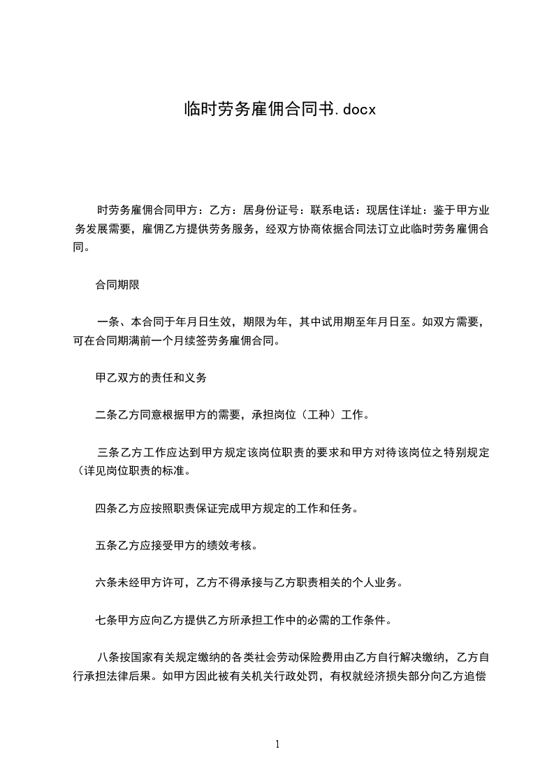第一条雇用期限_年,于_年_月_日至_年_月_日止。如双方必须要,可在合同期满前一个月协商续签劳务雇佣合同。