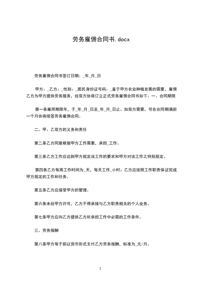 甲方:_乙方:_性别:_居民身份证号码:_鉴于甲方农业种植发展的必须要,雇佣乙方为甲方提供劳务服务,经双方协商订立正式劳务雇佣合同书如下:_一、合同期限
