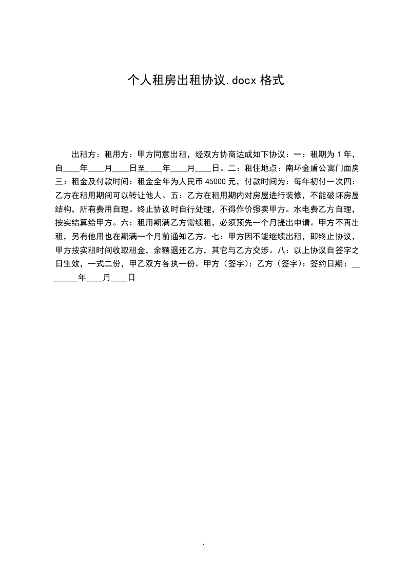 十、补充协议:_十一、本协议壹式_份,每份壹张贰页,甲乙各方各执壹份。甲方于_年申明:本房屋出租期限到_年底即_年_月_日止,届时甲方将收回自用。