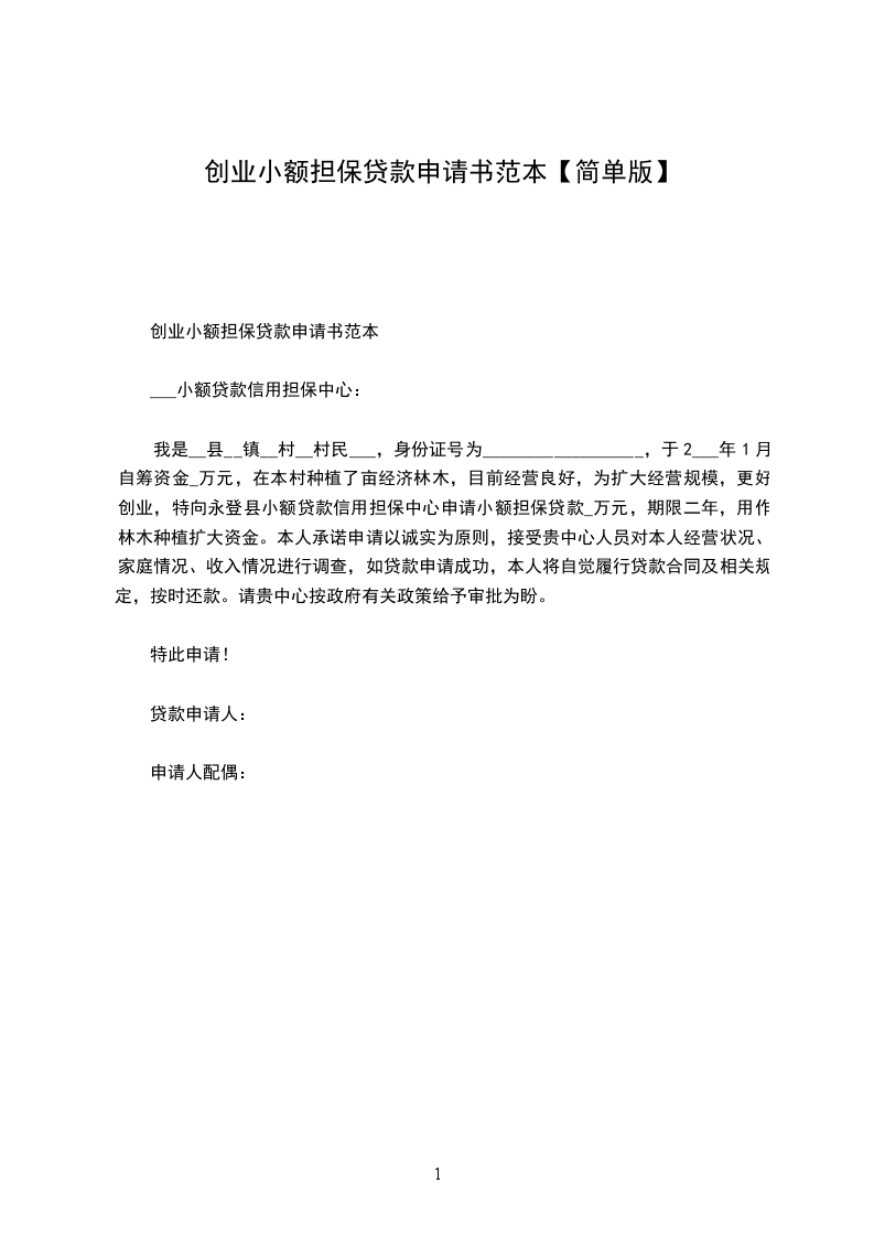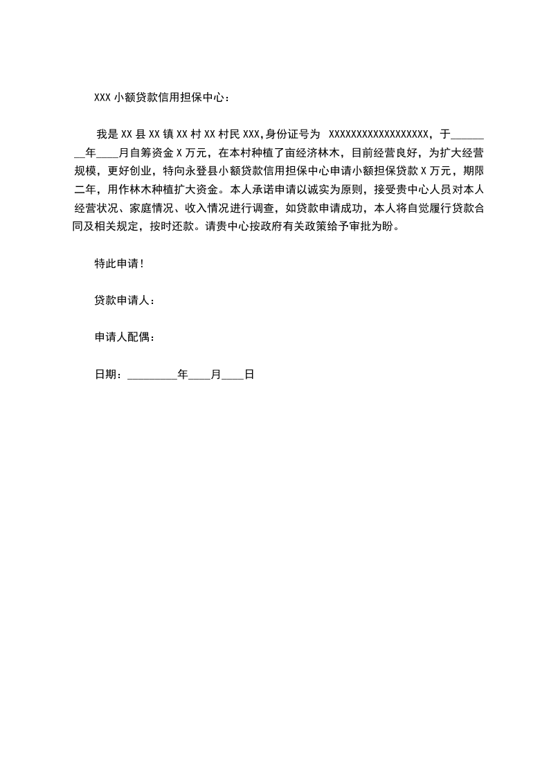 我是XX县XX镇XX村XX村民XXX,身份证号为XXXXXXXXXXXXXXXXXX,于________年____月自筹资金X万元,在本村种植了亩经济林木,目前经营良好,为扩大经营规模,更好创业,特向永登县小额贷款信用担保中心申请小额担保贷款X万元,期限二年,用作林木种植扩大资金。本人承诺申请以诚实为原则,接受贵中心人员对本人经营状况、家庭情况、收入情况进行调查,如贷款申请成功,本人将自觉履行贷款合同及相关规定,按时还款。请贵中心按政府有关政策给予审批为盼。